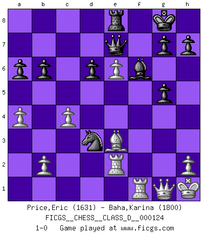 Last move : 1-0 2010 January 18 20:19:36 [Event "FICGS__CHESS__CLASS_D__000124"] [Site "FICGS"] [Date "2009.06.14"] [Round "1"] [White "Price,Eric"] [Black "Baha,Karina"] [Result "1-0"] [WhiteElo "1631"] [BlackElo "1800"] 1.e4 c5 2.Nf3 e6 3.d4 cxd4 4.Nxd4 a6 5.Nc3 Nc6 6.Be2 d6 7.O-O Nf6 8.Be3 Be7 9.a4 O-O 10.f4 Qc7 11.Kh1 Re8 12.Bf3 Bd7 13.Nb3 b6 14.g4 Bc8 15.Qe2 Bb7 16.Qf2 Nd7 17.g5 Nc5 18.Nd4 Nxd4 19.Bxd4 Rad8 20.Rae1 e5 21.Be3 exf4 22.Bxf4 f6 23.Nd5 Bxd5 24.exd5 fxg5 25.Be3 Bf6 26.Bh5 Re7 27.Qg2 Re5 28.Bg4 Rde8 29.Qg1 Qb7 30.c4 Nd3 31.Re2 Qe7 32.Be6+ Rxe6 33.dxe6 1-0 This chess game has been lost on time (started : 2009.06.14 19:25:13) Sicilian : Kan, 5.Nc3 Kingside Castling by player White (move 7) Kingside Castling by player Black (move 9) Player White won this chess game. Follow this game move after move (download)A player surprised is half beaten. (Proverb) Kasparov ist eine Art Monster mit hundert Augen, denen auch nicht das Geringste entgeht. (Tony Miles) Una de estas pequeñas movidas modestas pudieran ser mas molestas a tu oponente que la amenaza mas grande. (Siegbert Tarrasch) Roi des jeux et jeu des rois, les échecs portent en eux un sentiment d'infini. Ils donnent à celui qui s'est efforcé d'en approfondir les arcanes l'impression de n'être pas à la mesure de l'homme; en fait, ils constituent un résumé de l'univers, un microcosme, et figurent cette grande échelle qui, dans les plans de la lumière descend jusqu'à la matière, qui des abîmes insondables remonte jusqu'en l'infini de Dieu. (Pyrame) Whenever people agree with me, I always feel I must be wrong. (Oscar Wilde)