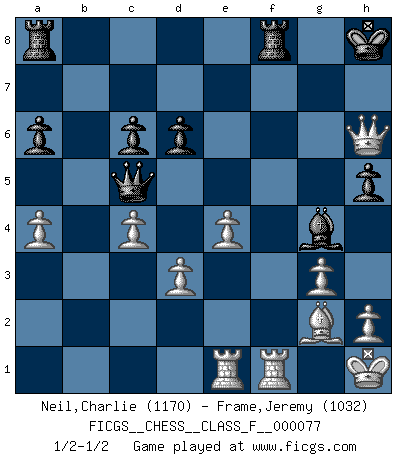 Last move : 1/2-1/2 2009 August 1 13:23:22 [Event "FICGS__CHESS__CLASS_F__000077"] [Site "FICGS"] [Date "2009.06.14"] [Round "1"] [White "Neil,Charlie"] [Black "Frame,Jeremy"] [Result "1/2-1/2"] [WhiteElo "1170"] [BlackElo "1032"] 1.c4 e5 2.g3 Nc6 3.Bg2 Nf6 4.Nc3 d6 5.d3 Be6 6.e4 Be7 7.Nge2 O-O 8.O-O a6 9.a3 Nd4 10.b4 Nxe2+ 11.Nxe2 c6 12.f4 exf4 13.Nxf4 Bg4 14.Qc2 h5 15.Bb2 Be6 16.Qe2 g6 17.a4 Bg4 18.Qe3 Nh7 19.Rae1 Bf6 20.Bxf6 Nxf6 21.b5 Re8 22.bxc6 bxc6 23.Qf2 Qa5 24.Nxg6 fxg6 25.Qxf6 Qc5+ 26.Kh1 Rf8 27.Qxg6+ Kh8 28.Qh6+ Kg8 29.Qg6+ Kh8 30.Qh6+ 1/2-1/2 English Opening Kingside Castling by player Black (move 7) Kingside Castling by player White (move 8) This chess game ended in a draw. Follow this game move after move (download)Strategy requires thought, tactics require observation. (Max Euwe) Der Umstand, daß uns eine 7 Stunden Zeitkontrolle ermöglicht eine großartige, tiefe Partie zu spielen, ist für die Massenmedien nicht weiter von Bedeutung. (Alexej Shirov) Hay jugadores fuertes y personas amables y yo soy un jugador fuerte. (Bobby Fischer) Le jeu d'échecs est comme rejeté hors du temps. (Antoine de Saint-Exupéry) If you know the enemy and know yourself you need not fear the results of a hundred battles. (Sun Tzu)
