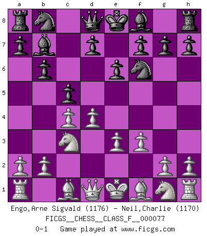 Last move : 0-1 2009 July 27 11:21:11 [Event "FICGS__CHESS__CLASS_F__000077"] [Site "FICGS"] [Date "2009.06.14"] [Round "1"] [White "Engo,Arne Sigvald"] [Black "Neil,Charlie"] [Result "0-1"] [WhiteElo "1176"] [BlackElo "1170"] 1.c4 Nf6 2.Nc3 b6 3.e3 Bb7 4.d4 e6 5.f3 c5 0-1 This chess game has been lost on time (started : 2009.06.14 22:26:11) English Opening Player Black won this chess game. Follow this game move after move (download)Bobby is the finest Chess player this country ever produced. His memory for the moves, his brilliance in dreaming up combinations, and his fierce determination to win are uncanny. (John Collins) Der Traum, für den ich lebe, ist der von einem freien Russland. Viele mögen sagen: Russland hat doch ein Parlament, einen gewählten Präsidenten. Aber ich spüre, dass in meiner Heimat die Angst wiederkehrt. Eine Angst, sich frei zu äußern, bestimmte Dinge zu tun (Garry Kasparov) Tu puedes aprender mucho mas de una partida que pierdas que de una partida ganada. Tendras que perder cientos de partidas antes de llegar a ser un buen jugador. (Jose Raul Capablanca) Mais n'est-ce pas déjà le limiter injurieusement que d'appeler les échecs un jeu? N'est-ce pas aussi une science, un art, ou quelque chose qui, comme le cercueil de Mahomet entre ciel et terre, est suspendu entre l'un et l'autre, et qui réunit un nombre incroyable de contraires ? (Stefan Zweig) They misunderestimated me. (George W. Bush, Bentonville nov. 6, 2000)