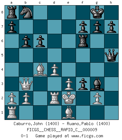 Last move : 0-1 2006 October 20 0:47:45 [Event "FICGS__CHESS__RAPID_C__000009"] [Site "FICGS"] [Date "2006.09.13"] [Round "1"] [White "Caburro,John"] [Black "Ruano,Pablo"] [Result "0-1"] [WhiteElo "1400"] [BlackElo "1400"] 1.d4 d5 2.c4 c6 3.Nf3 Nf6 4.e3 e6 5.Qb3 Bd6 6.Nc3 b6 7.cxd5 exd5 8.Bd3 O-O 9.O-O Re8 10.Bd2 Ne4 11.Rfd1 Bg4 12.Be2 Bxf3 13.Bxf3 Bxh2+ 14.Kf1 Qh4 15.Nxe4 dxe4 16.Be2 Re6 17.Bc4 Rf6 18.Be1 Bg3 19.Rd2 Qh1+ 20.Ke2 Qh5+ 21.f3 exf3+ 0-1 QGD Slav : 4.e3 Kingside Castling by player Black (move 8) Kingside Castling by player White (move 9) Player Black won this chess game. Follow this game move after move (download)Fischer is the strongest player in the world. In fact, the strongest player who ever lived. (Larry Evans) Wenn ich gewinne bin ich ein Genie. Wenn nicht, dann bin ich keines. (Robert James Fischer) Por tratar de evitar la pérdida de una pieza, muchas personas han perdido una partida de Ajedrez. (Savielly Tartakover) On croit qu'il y a plus de mauvais joueurs que de bons joueurs, c'est faux : Il y a autant de joueurs qui gagnent que de joueurs qui perdent. (Philippe Geluck) O divine art of subtlety and secrecy! Through you we learn to be invisible, through you inaudible and hence we can hold the enemy's fate in our hands. (Sun Tzu)