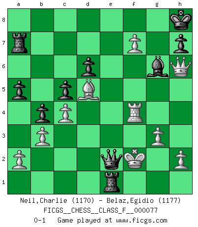 Last move : 0-1 2009 July 19 20:15:33 [Event "FICGS__CHESS__CLASS_F__000077"] [Site "FICGS"] [Date "2009.06.14"] [Round "1"] [White "Neil,Charlie"] [Black "Belaz,Egidio"] [Result "0-1"] [WhiteElo "1170"] [BlackElo "1177"] 1.c4 e5 2.Nc3 Nf6 3.g3 Be7 4.Bg2 O-O 5.d3 d6 6.e4 Nbd7 7.Be3 c5 8.Nge2 a6 9.O-O b6 10.Qd2 Bb7 11.f4 Ng4 12.fxe5 Nxe3 13.Qxe3 Nxe5 14.Nf4 Bg5 15.Qe2 Bc8 16.Nfd5 Bg4 17.Qc2 Be3+ 18.Nxe3 Bd7 19.Ncd5 b5 20.Rf4 Ng6 21.Rf2 b4 22.Raf1 f6 23.b3 Ne5 24.Qe2 a5 25.Nxf6+ gxf6 26.Nd5 f5 27.Qh5 Ra7 28.Ne3 Be6 29.exf5 Bf7 30.Qh6 Nxd3 31.Rf3 Ne5 32.f6 Nxf3+ 33.Rxf3 Bg6 34.Nd5 R8f7 35.Ne7+ Rfxe7 36.Rf4 Re1+ 37.Kf2 Qe8 38.Bd5+ Kh8 39.f7 Qe2+ 0-1 English : Carls' Bremen system Kingside Castling by player Black (move 4) Kingside Castling by player White (move 9) Player Black won this chess game. Follow this game move after move (download)In the perfect Chess combination as in a first-rate short story, the whole plot and counter-plot should lead up to a striking finale, the interest not being allayed until the very last moment. (Yates and Winter) Der Schachmeister von Heute braucht Courage, einen Killerinstinkt, Ausdauer und Arroganz. (Larry Evans) De todos mis libros Rusos, la defensa contiene y difunde el 'calor' mas grande que pudiese verse extraño al observar lo supremamente abstracto que el Ajedrez supuestamente es. (Vladimir Nabokov) RxDa4 pat (...) There are two types of people in this world, good and bad. The good sleep better, but the bad seem to enjoy the waking hours much more. (Woody Allen)