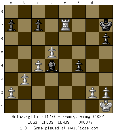 Last move : 1-0 2009 August 9 18:28:42 [Event "FICGS__CHESS__CLASS_F__000077"] [Site "FICGS"] [Date "2009.06.14"] [Round "1"] [White "Belaz,Egidio"] [Black "Frame,Jeremy"] [Result "1-0"] [WhiteElo "1177"] [BlackElo "1032"] 1.e4 e5 2.f4 d5 3.Nc3 d4 4.Nce2 Bd6 5.Nf3 Nc6 6.d3 Nf6 7.fxe5 Nxe5 8.Nexd4 Bg4 9.Be2 Nxf3+ 10.Nxf3 Bc5 11.Bg5 O-O 12.c3 h6 13.d4 Nxe4 14.Bxh6 gxh6 15.O-O Bxf3 16.Bxf3 Kh8 17.Bxe4 Bd6 18.Bxb7 Rb8 19.Qf3 Qg5 20.b3 f5 21.c4 Rfe8 22.Bc6 f4 23.Bxe8 Rxe8 24.d5 Re3 25.Qf2 Qe5 26.Rfe1 Bc5 27.Kh1 Rxe1+ 28.Rxe1 Qd4 29.Re8+ Kh7 30.Qxd4 Bxd4 31.Re7+ 1-0 KGD : Falkbeer, Milner-Barry variation Kingside Castling by player Black (move 11) Kingside Castling by player White (move 15) Player White won this chess game. Follow this game move after move (download)Checkers is for tramps. (Paul Morphy) Um sich vor der Gefahr einer Erkältung zu schützen, sorge der wanderlustige König beizeiten für ein brauchbares Versteck. (Aaron Nimzowitsch) Del Ajedrez se ha dicho que la vida no es lo suficientemente larga para él, pero eso es culpa de la vida, no del Ajedrez. (William Ewart Napier) L'ordinateur a tué l'originalité. Il n'y a plus guère d'aventures sur l'échiquier. (Jacob Murray) Excelling at chess has long been considered a symbol of more general intelligence. That is an incorrect assumption in my view, as pleasant as it might be. But for the purposes of argument and investigation, chess is, in Russkin-Gutman's words, 'an unparalleled laboratory, since both the learning process and the degree of ability obtained can be objectified and quantified, providing an excellent comparative framework on which to use rigorous analytical techniques.' (The Chess Master and the Computer, by Garry Kasparov - 2010)