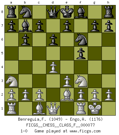 Last move : 1-0 2009 July 27 11:44:32 [Event "FICGS__CHESS__CLASS_F__000077"] [Site "FICGS"] [Date "2009.06.14"] [Round "1"] [White "Benreguia,Frederic"] [Black "Engo,Arne Sigvald"] [Result "1-0"] [WhiteElo "1049"] [BlackElo "1176"] 1.d4 f5 2.Nf3 b6 3.e3 Bb7 4.Be2 Nf6 5.O-O d6 6.Na3 1-0 This chess game has been lost on time (started : 2009.06.14 22:26:11) Dutch Kingside Castling by player White (move 5) Player White won this chess game. Follow this game move after move (download)In Chess, at least, the brave inherit the earth. (Edmar Mednis) Was ist der Unterschied zwischen einem Strassenarbeiter und einem Schachspieler? --Der Schachspieler bewegt sich ab und zu. (Anonymous) El Ajedrez por encima de todo... ¡es una pelea!. (Emanuel Lasker) Les Echecs ne sont pas pour les âmes timides. Ils requièrent un homme entier, qui ne s'arrête pas aveuglément à ce qui a été déjà établi, mais qui tente individuellement de sonder les profondeurs du jeu. (W. Steinitz) Wisdom doesn't necessarily come with age. Sometimes age just shows up all by itself. (Tom Watson)