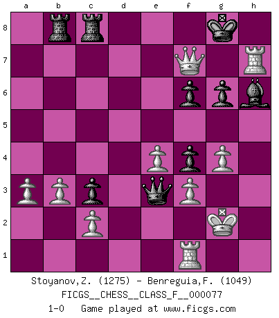 Last move : 1-0 2009 July 4 17:1:16 [Event "FICGS__CHESS__CLASS_F__000077"] [Site "FICGS"] [Date "2009.06.14"] [Round "1"] [White "Stoyanov,Zdravko"] [Black "Benreguia,Frederic"] [Result "1-0"] [WhiteElo "1275"] [BlackElo "1049"] 1.e4 e5 2.Nf3 d6 3.h3 Nh6 4.d3 g6 5.Bxh6 Bxh6 6.Be2 c5 7.Nc3 a5 8.O-O Na6 9.Nd5 Be6 10.Nc3 O-O 11.a3 b6 12.Nd2 f6 13.Bg4 Bxg4 14.hxg4 Qd7 15.Nd5 Qb7 16.Nc4 Nc7 17.Nxd6 Qb8 18.Ne7+ Kg7 19.Nd5 Nxd5 20.Nc4 b5 21.Nd2 Nf4 22.Nb3 c4 23.dxc4 a4 24.Nc5 Rd8 25.Qe1 bxc4 26.Rb1 Qc7 27.Qe3 Ra5 28.g3 Rxc5 29.gxf4 exf4 30.Qc3 Bg5 31.Qb4 Ra8 32.f3 c3 33.b3 Qa7 34.Kg2 Rb8 35.Qxa4 Qc7 36.Rfd1 Kh8 37.Rd7 Qb6 38.Rbd1 Rc6 39.Rf7 Qe3 40.Rf1 R6c8 41.Qd7 Bh6 42.Rxh7+ Kg8 43.Qf7+ 1-0 Philidor's defense Kingside Castling by player White (move 8) Kingside Castling by player Black (move 10) Player White won this chess game. Follow this game move after move (download)Could we look into the head of a Chess player, we should see there a whole world of feelings, images, ideas, emotion and passion. (Alfred Binet) Der Knackpunkt bei der Konzentration ist, daß wir nur durch sie etwas Neues und Ungewöhnliches am Schachbrett finden können. Sie ist der einzige Weg durch neue neue Ideen eine Überraschung zu bereiten. (Garry Kasparov) La vida es como el Ajedrez, con lucha, competición y eventos buenos y malos. (Benjamin Franklin) La victoire dans une partie d'Echecs appartient la plupart du temps à celui qui voit un peu plus loin que l'adversaire. (Lasker) Are you threatening me, Master Jedi ? (Chancellor Palpatine in Star Wars ep.3)