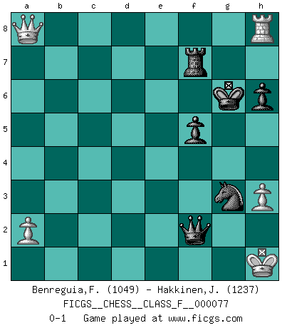 Last move : 0-1 2009 September 23 14:37:9 [Event "FICGS__CHESS__CLASS_F__000077"] [Site "FICGS"] [Date "2009.06.14"] [Round "1"] [White "Benreguia,Frederic"] [Black "Hakkinen,Jorma"] [Result "0-1"] [WhiteElo "1049"] [BlackElo "1237"] 1.e4 c6 2.c3 d5 3.d3 dxe4 4.d4 e5 5.Qa4 exd4 6.cxd4 b5 7.Qb3 Be6 8.Qc3 Nf6 9.Be2 Na6 10.Qxc6+ Nd7 11.Qxa6 Be7 12.Qxb5 O-O 13.b4 Rb8 14.Qa4 Bxb4+ 15.Nd2 Bxd2+ 16.Bxd2 Rb2 17.Qxa7 f5 18.Bc3 Rc2 19.Bb4 Rf7 20.Qa4 Qc7 21.Nh3 Rc1+ 22.Rxc1 Qxc1+ 23.Bd1 e3 24.O-O exf2+ 25.Kxf2 Qb2+ 26.Be2 Bc4 27.Re1 Qxd4+ 28.Kf1 Bxe2+ 29.Rxe2 h6 30.Rd2 Qe5 31.g3 Nf6 32.Nf4 Ne4 33.Qa8+ Kh7 34.Rd8 Qa1+ 35.Kg2 Qb2+ 36.Kh3 Nf2+ 37.Kh4 g5+ 38.Kh5 gxf4 39.Be1 Ng4 40.h3 Nf6+ 41.Kh4 fxg3 42.Rh8+ Kg6 43.Kxg3 Qe5+ 44.Kf2 Ne4+ 45.Kf1 Qb5+ 46.Kg2 Qe2+ 47.Kh1 Qxe1+ 48.Kg2 Qf2+ 49.Kh1 Ng3+ 0-1 Caro-Kann defense Kingside Castling by player Black (move 12) Kingside Castling by player White (move 24) Player Black won this chess game. Follow this game move after move (download)I look one move ahead... the best ! (Siegbert Tarrasch) Ich möchte Schüler heranbilden, die das Vermögen haben, selbst zu denken und Kritik zu üben. (Emanuel Lasker) Repentinamente, me resultaba obvio en mi analisis que yo había pasado por alto lo que Fischer había visto en el tablero con la mas grande facilidad. (Mikhail Botvinnik) Roi des jeux et jeu des rois, les échecs portent en eux un sentiment d'infini. Ils donnent à celui qui s'est efforcé d'en approfondir les arcanes l'impression de n'être pas à la mesure de l'homme; en fait, ils constituent un résumé de l'univers, un microcosme, et figurent cette grande échelle qui, dans les plans de la lumière descend jusqu'à la matière, qui des abîmes insondables remonte jusqu'en l'infini de Dieu. (Pyrame) Beta. Software undergoes beta testing shortly before it's released. Beta is latin for still doesn't work. (Anonymous)