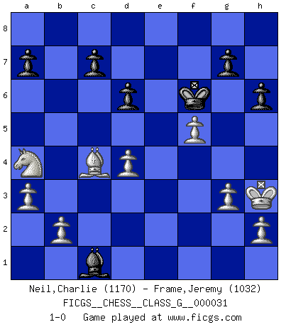 Last move : 1-0 2009 July 31 20:1:5 [Event "FICGS__CHESS__CLASS_G__000031"] [Site "FICGS"] [Date "2009.06.15"] [Round "1"] [White "Neil,Charlie"] [Black "Frame,Jeremy"] [Result "1-0"] [WhiteElo "1170"] [BlackElo "1032"] 1.c4 e5 2.g3 d6 3.Bg2 Nc6 4.Nc3 Be6 5.d3 Nf6 6.Bg5 Be7 7.e4 O-O 8.Nge2 h6 9.Bxf6 Bxf6 10.O-O Bg5 11.f4 exf4 12.Nxf4 Qd7 13.Nxe6 fxe6 14.Qg4 Be3+ 15.Kh1 Rxf1+ 16.Rxf1 Rf8 17.a3 Rxf1+ 18.Bxf1 Qf7 19.Bg2 Qf2 20.Qxe6+ Kh8 21.Qc8+ Kh7 22.Qf5+ Qxf5 23.exf5 Nd4 24.Bxb7 Bc1 25.Na4 Nc2 26.Be4 Kg8 27.Kg2 Ne3+ 28.Kh3 Kf7 29.d4 Nxc4 30.Bd5+ Kf6 31.Bxc4 1-0 English Opening Kingside Castling by player Black (move 7) Kingside Castling by player White (move 10) Player White won this chess game. Follow this game move after move (download)All Chess players should have a hobby. (Savielly Tartakower) Wenn sie aufgeben, dann danke ich Ihnen für das Spiel (Eventualzug beim Fernschach). (Anonymous) El Ajedrez es tan interesante por sí solo, que no es necesario un interés monetario para persuadir a una persona a que lo practique; por lo tanto, nunca se juega por dinero. (Benjamin Franklin) Mais n'est-ce pas déjà le limiter injurieusement que d'appeler les échecs un jeu? N'est-ce pas aussi une science, un art, ou quelque chose qui, comme le cercueil de Mahomet entre ciel et terre, est suspendu entre l'un et l'autre, et qui réunit un nombre incroyable de contraires ? (Stefan Zweig) Without deviation from the norm, progress is not possible. (Frank Zappa)
