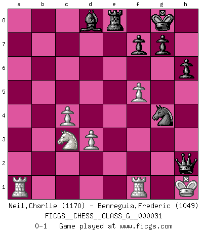 Last move : 0-1 2009 July 10 23:22:55 [Event "FICGS__CHESS__CLASS_G__000031"] [Site "FICGS"] [Date "2009.06.15"] [Round "1"] [White "Neil,Charlie"] [Black "Benreguia,Frederic"] [Result "0-1"] [WhiteElo "1170"] [BlackElo "1049"] 1.c4 e5 2.Nc3 Nf6 3.g3 c5 4.Bg2 d6 5.d3 b6 6.Bxa8 Nbd7 7.Bg2 Be7 8.a3 a6 9.e4 O-O 10.Nge2 Bb7 11.O-O a5 12.h3 Qc7 13.Be3 Qc6 14.Bg5 Ba6 15.f4 h6 16.Bxf6 Bxf6 17.Nd5 Bd8 18.Nec3 b5 19.b3 b4 20.axb4 axb4 21.Qg4 bxc3 22.Nxc3 Nf6 23.Qe2 exf4 24.e5 Qd7 25.gxf4 dxe5 26.Qxe5 Qc8 27.f5 Re8 28.Qd6 Bb7 29.Bxb7 Qxb7 30.Qa6 Qxb3 31.Qa3 Qb8 32.Qxc5 Qg3+ 33.Kh1 Qxh3+ 34.Kg1 Ng4 35.Qd6 Qe3+ 36.Kh1 Qh3+ 37.Qh2 Qxh2+ 0-1 English : Carls' Bremen system Kingside Castling by player Black (move 9) Kingside Castling by player White (move 11) Player Black won this chess game. Follow this game move after move (download)A big shock; the best chess player in history has passed away. (Lajos Portisch, about Bobby Fischer's death) Ich moechte nie einem Club beitreten, der Leute wie mich als Mitglieder aufnimmt. (Woody Allen) No nos podemos resistir a la fascinación de un sacrificio ya que la pasión por los sacrificios es parte de la naturaleza de un jugador de Ajedrez. (Rudolf Spielman) Toutes les manuvres exécutées sur une colonne ouverte ont pour but ultime l'intrusion définitive sur la septième ou la huitième rangée, en plein cur de la position ennemie. (Aaron Nimzovitch) Bobby never cared about money, though. His only desire was to prove that his choices were correct: He wanted chess to be important because he was a chess player, and he wanted to be important. Bobby knew money was important, but he didn't have a clue why, outside of clothes and status. The only way he could accomplish what he wanted was to fight for a lot of money. Once he got it, he gave it away. He did not know how to spend it. And once he'd become champion, after, essentially, sacrificing his life for it, he didn't know how to spend his time. (Bob Wade)