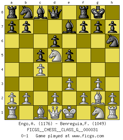 Last move : 0-1 2009 July 27 11:21:11 [Event "FICGS__CHESS__CLASS_G__000031"] [Site "FICGS"] [Date "2009.06.15"] [Round "1"] [White "Engo,Arne Sigvald"] [Black "Benreguia,Frederic"] [Result "0-1"] [WhiteElo "1176"] [BlackElo "1049"] 1.c4 e5 2.Nc3 d6 3.e3 c5 4.g3 Nh6 5.Bg2 Be7 6.Nd5 O-O 0-1 This chess game has been lost on time (started : 2009.06.15 10:47:0) English Opening Kingside Castling by player Black (move 6) Player Black won this chess game. Follow this game move after move (download)The defensive power of a pinned piece is only imaginary. (Aaron Nimzovich) Es ist nicht das erste mal, dass sich die FIDE dem Arabischen Geld gebeugt hat (über die FIDE WM 2004 in Lybien). (Larry Evans) Repentinamente, me resultaba obvio en mi analisis que yo había pasado por alto lo que Fischer había visto en el tablero con la mas grande facilidad. (Mikhail Botvinnik) Ce n'est pas pour s'amuser qu'il joue aux échecs : il célèbre un culte. (Vladimir Nabokov) Chess is as much a mystery as women. (Purdy)