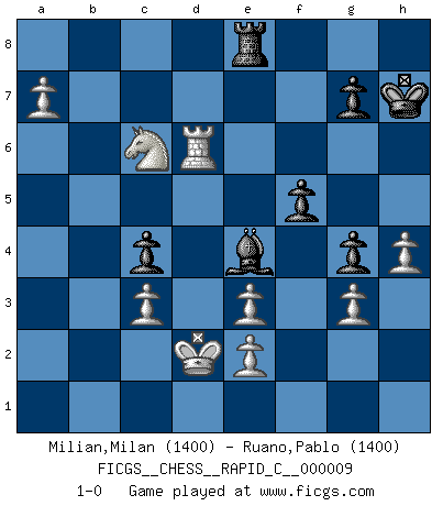 Last move : 1-0 2007 January 14 18:8:58 [Event "FICGS__CHESS__RAPID_C__000009"] [Site "FICGS"] [Date "2006.09.13"] [Round "1"] [White "Milian,Milan"] [Black "Ruano,Pablo"] [Result "1-0"] [WhiteElo "1400"] [BlackElo "1400"] 1.c4 e5 2.Nc3 Nc6 3.g3 Bb4 4.Bg2 Nf6 5.a3 Bxc3 6.dxc3 O-O 7.Nf3 e4 8.Nd4 d6 9.O-O Ne5 10.b3 Re8 11.Bg5 h6 12.Bxf6 Qxf6 13.Qc2 e3 14.fxe3 Qg5 15.Qe4 Rb8 16.Nb5 Re7 17.Qd4 Nc6 18.Qf4 a6 19.Nd4 Ne5 20.Qxg5 hxg5 21.h3 Bd7 22.Kf2 g4 23.h4 c5 24.Nc2 b5 25.cxb5 Rxb5 26.b4 Nc4 27.Bd5 Be6 28.a4 Rb8 29.Bxc4 Bxc4 30.Rfb1 Re6 31.bxc5 Rxb1 32.Rxb1 Rf6+ 33.Ke1 dxc5 34.Rb8+ Kh7 35.a5 Re6 36.Rb6 Bd5 37.Kd2 c4 38.Nb4 Re5 39.Rxa6 f5 40.Rd6 Bb7 41.a6 Be4 42.a7 Re8 43.Nc6 1-0 This chess game has been lost on time (started : 2006.09.13 18:23:54) English : Sicilian Reversed Kingside Castling by player Black (move 6) Kingside Castling by player White (move 9) Player White won this chess game. Follow this game move after move (download)You know you're going to lose. Even when I was ahead I knew I was going to lose. - On playing against Fischer. (Andrew Soltis) Privat ist Kortschnoi kein schlechter Mensch, sehr sympathisch. Aber während des Spiels ist er grausam. Er will dich töten. (Miguel Najdorf) Si tu oponente no puede hacer nada activo, entonces no apures la posición; En vez de eso, dejalo estar sentado ahí, sufriendo y rogandote por un empate. (Jeremy Silman) Aux échecs, l'amour-propre est satisfait quand on remporte la victoire, mais il n'y a pas de honte à être battu. (Benjamin Franklin) There are two types of people in this world, good and bad. The good sleep better, but the bad seem to enjoy the waking hours much more. (Woody Allen)