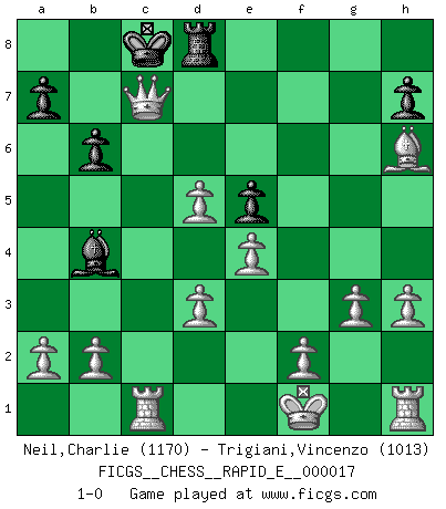 Last move : 1-0 2009 July 8 22:39:59 [Event "FICGS__CHESS__RAPID_E__000017"] [Site "FICGS"] [Date "2009.06.16"] [Round "1"] [White "Neil,Charlie"] [Black "Trigiani,Vincenzo"] [Result "1-0"] [WhiteElo "1170"] [BlackElo "1013"] 1.c4 e5 2.g3 Bc5 3.Bg2 Nc6 4.Nc3 Nf6 5.d3 Ng4 6.e3 f6 7.Qxg4 d6 8.Qxg7 Rf8 9.Nd5 Bb4+ 10.Kf1 Bf5 11.e4 Be6 12.Nf3 Qe7 13.Nxe7 Nxe7 14.Bh6 O-O-O 15.Qxe7 Rfe8 16.Qxf6 Bg4 17.h3 Bxf3 18.Bxf3 d5 19.cxd5 Rd7 20.Bg4 b6 21.Bxd7+ Kxd7 22.Rc1 Kc8 23.Qc6 Rd8 24.Qxc7+ 1-0 English Opening Queenside Castling by player Black (move 14) Player White won this chess game. Follow this game move after move (download)A bad day of Chess is better than any good day at work. (Anonymous) Frage des Reporters: -Welche besonderen Umstände rechtfertigen das Anhalten der Uhren während einer Turnierpartie? Antwort: -Einen Fotographen zu strangulieren. (Siegbert Tarrasch) Cada Peón es una Reina en potencia. (James Mason) Karpov est une pièce de musée. (Garry Kasparov) At work, the authority of a person is inversely proportional to the number of pens that person is carrying. (Dan Rotaru)