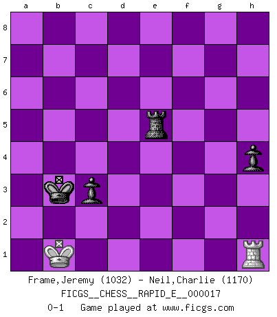 Last move : 0-1 2009 August 14 2:41:45 [Event "FICGS__CHESS__RAPID_E__000017"] [Site "FICGS"] [Date "2009.06.16"] [Round "1"] [White "Frame,Jeremy"] [Black "Neil,Charlie"] [Result "0-1"] [WhiteElo "1032"] [BlackElo "1170"] 1.e4 e5 2.Nf3 Nc6 3.Bc4 Bc5 4.O-O d6 5.Nc3 Be6 6.a3 Bxc4 7.d3 Be6 8.Be3 Bxe3 9.fxe3 Qd7 10.d4 Bg4 11.h3 Bh5 12.g4 Bg6 13.dxe5 Nxe5 14.Nxe5 Qe6 15.Nxg6 Qxg6 16.Qf3 Ne7 17.Rf2 O-O-O 18.Raf1 f6 19.Nd5 Nxd5 20.exd5 Rhf8 21.Qf5+ Qxf5 22.Rxf5 Rde8 23.g5 Rxe3 24.gxf6 Rxf6 25.Rxf6 gxf6 26.Rxf6 Rxh3 27.Rf8+ Kd7 28.Rf7+ Kd8 29.Rf8+ Ke7 30.Rb8 b6 31.Rb7 Kd7 32.Rxa7 Rh5 33.Ra4 Rxd5 34.Rc4 h5 35.Rh4 Rc5 36.c3 Rb5 37.b4 Kc6 38.Kf2 Re5 39.Kf3 Kb5 40.Rf4 Ka4 41.Rf7 c5 42.Rb7 Kb5 43.a4+ Kxa4 44.Rxb6 c4 45.Rxd6 Kb3 46.Rd4 Kxc3 47.Re4 Rb5 48.Kg3 Kxb4 49.Rh4 Kc3 50.Kf2 Rc5 51.Ke1 Kc2 52.Rh2+ Kb3 53.Kd1 c3 54.Kc1 Ra5 55.Kb1 Re5 56.Rh1 h4 0-1 Giuoco Piano Kingside Castling by player White (move 4) Queenside Castling by player Black (move 17) 10 pieces endgame at move 43 : White KRPP , Black KRPPPP WHITE : King + 1 Rook 2 Pawns BLACK : King + 1 Rook 4 Pawns 9 pieces endgame at move 44 : White KRPP , Black KRPPP WHITE : King + 1 Rook 2 Pawns BLACK : King + 1 Rook 3 Pawns 8 pieces endgame at move 45 : White KRPP , Black KRPP WHITE : King + 1 Rook 2 Pawns BLACK : King + 1 Rook 2 Pawns 7 pieces endgame at move 46 : White KRP , Black KRPP WHITE : King + 1 Rook 1 Pawn BLACK : King + 1 Rook 2 Pawns 6 pieces endgame at move 48 : White KR , Black KRPP WHITE : King + 1 Rook BLACK : King + 1 Rook 2 Pawns Player Black won this chess game. Follow this game move after move (download)The Pin is mightier than the sword. (Fred Reinfeld) Ich tröste mich mit dem Vergnügen, daß Schachfans, Zuschauer und Leser glücklich sind, wenn ein Großmeister etwas riskiert, statt nur Klötzchen zu schieben. (Mikhail Nekhemyevich Tal) El Ajedrez, como cualquier otra actividad creativa, puede existir solo a través de méritos combinados de aquellos que tienen talento creativo y de aquellos que tienen la habilidad de organizar un trabajo creativo. (Mikhail Botvinnik) Le pion, dans sa simplicité, marche droit devant lui, mais lorsqu'il prend, il le fait obliquement? Ainsi l'homme, tant qu'il reste pauvre, marche dans la droiture et vit honnêtement, mais lorsqu'il recherche les honneurs, il flatte, se parjure et, par les voies obliques, cherche une position supérieure sur l'échiquier du monde. (Jean de Galles) I find your interest interesting. (Gregory House, House M.D.)