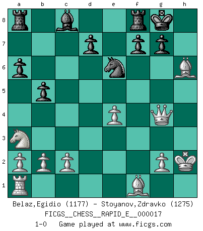 Last move : 1-0 2009 June 30 13:39:35 [Event "FICGS__CHESS__RAPID_E__000017"] [Site "FICGS"] [Date "2009.06.16"] [Round "1"] [White "Belaz,Egidio"] [Black "Stoyanov,Zdravko"] [Result "1-0"] [WhiteElo "1177"] [BlackElo "1275"] 1.e4 c5 2.Bc4 Nc6 3.Nf3 h6 4.O-O e6 5.Nc3 Be7 6.d4 cxd4 7.Nxd4 Nxd4 8.Qxd4 Bf6 9.Qd3 Ne7 10.Nb5 O-O 11.f3 Be5 12.f4 a6 13.Na3 Bc7 14.f5 Nc6 15.Qf3 b5 16.Bd3 Nd4 17.Qg4 Qf6 18.fxe6 Bxh2+ 19.Kxh2 Qxf1 20.Bxf1 Nxe6 21.Bxh6 1-0 Sicilian defense Kingside Castling by player White (move 4) Kingside Castling by player Black (move 10) Player White won this chess game. Follow this game move after move (download)In order to improve your game, you must study the endgame before everything else, for whereas the endings can be studied and mastered by themselves, the middle game and the opening must be studied in relation to the endgame. (Jose Raul Capablanca) Wenn es im Universum noch irgendwo intelligente Lebewesen gibt, dann kennen sie Go. (Emanuel Lasker) El Rey es una pieza de pelea. ¡Usenlo!. (Wilhelm Steinitz) Je ne crois pas en la psychologie, je crois aux bons coups. (Robert Fischer) What doesn't kill us makes us stronger. (Friedrich Nietzsche)