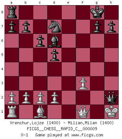Last move : 0-1 2006 September 20 13:38:6 [Event "FICGS__CHESS__RAPID_C__000009"] [Site "FICGS"] [Date "2006.09.13"] [Round "1"] [White "Vrenchur,Lojze"] [Black "Milian,Milan"] [Result "0-1"] [WhiteElo "1400"] [BlackElo "1400"] 1.e4 e5 2.Bc4 Nf6 3.Nc3 Bb4 4.Nf3 O-O 5.Nd5 Nxd5 6.Bxd5 c6 7.Bc4 d5 8.Bd3 f5 9.Be2 fxe4 10.Nxe5 Qf6 11.Ng4 Bxg4 12.O-O Bxe2 13.Qxe2 Nd7 14.Kh1 Bd6 15.f3 exf3 16.Rxf3 Qe5 17.Qf1 Rxf3 18.gxf3 Qxh2+ 0-1 Bishop's Opening : Berlin defense Kingside Castling by player Black (move 4) Kingside Castling by player White (move 12) Player Black won this chess game. Follow this game move after move (download)For me, Chess is life and every game is like a new life. Every Chess player gets to live many lives in one lifetime. (Eduard Gufeld) Das Schachspiel ist ein See, in welchem eine Mücke baden und ein Elefant ertrinken kann. (Emanuel Lasker) Hasta este punto, las blancas han seguido un análisis bien conocido. Pero ahora el hace un error fatal: empieza a usar su propia cabeza. (Siegbert Tarrasch) Le plus grand jeu de l'esprit jamais inventé, plus vous l'apprenez, plus vous y prenez du plaisir. (Garry Kasparov) When the going gets tactical, the computers get going. (Hyatt)