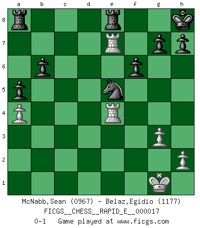 Last move : 0-1 2009 August 10 10:38:35 [Event "FICGS__CHESS__RAPID_E__000017"] [Site "FICGS"] [Date "2009.06.16"] [Round "1"] [White "McNabb,Sean"] [Black "Belaz,Egidio"] [Result "0-1"] [WhiteElo "0967"] [BlackElo "1177"] 1.d4 d5 2.c4 Nf6 3.Nc3 e6 4.Bg5 dxc4 5.e4 Be7 6.Bxc4 O-O 7.Nf3 Bd7 8.e5 Nh5 9.Bxe7 Qxe7 10.O-O f6 11.Qb3 b6 12.Nb5 Bc6 13.Bxe6+ Kh8 14.Nc3 Nf4 15.d5 Bd7 16.Rad1 Nxe6 17.d6 cxd6 18.exd6 Qe8 19.Nd5 Qd8 20.Nd4 Nxd4 21.Rxd4 Be6 22.Re1 Qxd6 23.Qb5 Bxd5 24.Rxd5 Qc6 25.Qxc6 Nxc6 26.Rd6 Ne5 27.f4 Nc4 28.Rde6 Nxb2 29.Re7 Nd3 30.Rd1 Nxf4 31.R1d7 Rg8 32.g3 Ng6 33.Re4 Ne5 34.Re7 a5 35.a4 Rge8 0-1 QGD : Marshall defense Kingside Castling by player Black (move 6) Kingside Castling by player White (move 10) Player Black won this chess game. Follow this game move after move (download)A passed Pawn increases in strength as the number of pieces on the board diminishes. (Capablanca) Das typische an einem Großmeister ist, daß er eine gewonnene Position schnell und schmerzlos gewinnt. (Irving Chernev) No es una movida, aún la mejor movida que tu debas buscar, sino un plan comprensible. (Eugene Znosko-Borovsky) A chaque perte on perd un peu de soi. (Joël Lautier) A computer lets you make more mistakes faster than any invention in human history - with the possible exceptions of handguns and tequila. (Mitch Ratcliffe)
