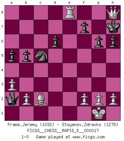 Last move : 1-0 2009 July 7 20:50:39 [Event "FICGS__CHESS__RAPID_E__000017"] [Site "FICGS"] [Date "2009.06.16"] [Round "1"] [White "Frame,Jeremy"] [Black "Stoyanov,Zdravko"] [Result "1-0"] [WhiteElo "1032"] [BlackElo "1275"] 1.e4 c5 2.Nf3 Nc6 3.c3 a6 4.d4 cxd4 5.cxd4 e6 6.Nc3 Bb4 7.Bd3 h6 8.Bd2 b5 9.a3 Ba5 10.d5 exd5 11.O-O Nge7 12.Nxd5 Nxd5 13.Bxa5 Nxa5 14.exd5 Bb7 15.Re1+ Kf8 16.Qd2 Bxd5 17.Qe3 Qf6 18.Ne5 Be6 19.Rac1 d6 20.Nc6 Nb3 21.Rc3 Nc5 22.Nd4 Re8 23.Nxe6+ Rxe6 24.Qd2 g6 25.Rxe6 Qxe6 26.Bc2 Qa2 27.Qd4 Kg8 28.Re3 a5 29.Re8+ Kh7 30.Qxh8+ 1-0 Sicilian defense Kingside Castling by player White (move 11) Player White won this chess game. Follow this game move after move (download)You know you're going to lose. Even when I was ahead I knew I was going to lose. - On playing against Fischer. (Andrew Soltis) Ich moechte nie einem Club beitreten, der Leute wie mich als Mitglieder aufnimmt. (Woody Allen) Si tu oponente no puede hacer nada activo, entonces no apures la posición; En vez de eso, dejalo estar sentado ahí, sufriendo y rogandote por un empate. (Jeremy Silman) Aux échecs, l'amour-propre est satisfait quand on remporte la victoire, mais il n'y a pas de honte à être battu. (Benjamin Franklin) The man who strikes first admits that his ideas have given out. (Chinese proverb)