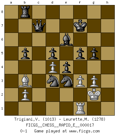 Last move : 0-1 2009 July 25 9:47:46 [Event "FICGS__CHESS__RAPID_E__000017"] [Site "FICGS"] [Date "2009.06.16"] [Round "1"] [White "Trigiani,Vincenzo"] [Black "Leurette,Marc-Antoine"] [Result "0-1"] [WhiteElo "1013"] [BlackElo "1278"] 1.d4 d5 2.Bf4 Nf6 3.Nc3 Bf5 4.Nf3 Nc6 5.Nb5 Rc8 6.Nxc7+ Rxc7 7.Bxc7 Qxc7 8.e3 e5 9.Qd2 Bb4 10.c3 e4 11.Nh4 Bg4 12.cxb4 O-O 13.Bb5 a6 14.Ba4 b5 15.Bc2 a5 16.O-O axb4 17.Bb3 g5 18.Nf5 Bxf5 19.Qe2 Rb8 20.a3 h5 21.axb4 Nxb4 22.Qd1 Ng4 23.Ra5 Qxa5 24.Qe1 Be6 25.Qc1 f5 26.Qc5 Kf7 27.Qc7+ Qxc7 28.g3 h4 29.Kg2 hxg3 30.hxg3 Nd3 31.f3 Nxe3+ 0-1 Queen's pawn, Mason variation Kingside Castling by player Black (move 12) Kingside Castling by player White (move 16) Player Black won this chess game. Follow this game move after move (download)Strategy requires thought, tactics require observation. (Max Euwe) Irgendwie scheint mir sonntags früh um 9 Uhr der Killerinstinkt verloren gegangen zu sein. (Alexej Shirov) La esencia del Ajedrez es pensar acerca de lo que el Ajedrez es. (David Bronstein) Dieu déplace le joueur, et celui-ci la pièce. Quel Dieu derrière Dieu commence donc la trame ? Arturo Perez-Reverte (prix de littérature policière 1993). Excelling at chess has long been considered a symbol of more general intelligence. That is an incorrect assumption in my view, as pleasant as it might be. But for the purposes of argument and investigation, chess is, in Russkin-Gutman's words, 'an unparalleled laboratory, since both the learning process and the degree of ability obtained can be objectified and quantified, providing an excellent comparative framework on which to use rigorous analytical techniques.' (The Chess Master and the Computer, by Garry Kasparov - 2010)