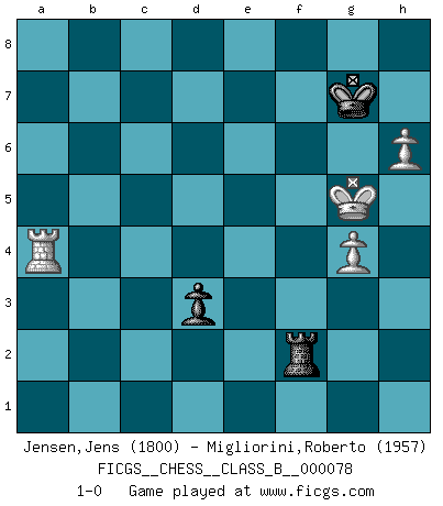 Last move : 1-0 2009 September 10 17:23:42 [Event "FICGS__CHESS__CLASS_B__000078"] [Site "FICGS"] [Date "2009.06.17"] [Round "1"] [White "Jensen,Jens"] [Black "Migliorini,Roberto"] [Result "1-0"] [WhiteElo "1800"] [BlackElo "1957"] 1.e4 e5 2.Nf3 Nc6 3.Bc4 Bc5 4.c3 Nf6 5.d4 exd4 6.e5 d5 7.Bb5 Ne4 8.cxd4 Bb6 9.Nc3 O-O 10.Be3 Bg4 11.O-O f5 12.Bxc6 bxc6 13.Ne2 c5 14.dxc5 Bxf3 15.cxb6 Bxe2 16.bxc7 Qxc7 17.Qxe2 f4 18.Bd4 f3 19.Qb5 Qf7 20.g3 Qe6 21.Rfc1 Nd2 22.Kh1 Nc4 23.b3 Rfb8 24.Qa4 Nxe5 25.Rc7 a5 26.Re1 Rb4 27.Rxe5 Rxa4 28.Rxe6 Rxd4 29.h4 Rd8 30.Kh2 Rd2 31.R6e7 Kh8 32.Rxg7 Rxf2+ 33.Kh3 h6 34.Rh7+ Kg8 35.Rcg7+ Kf8 36.Ra7 Kg8 37.Rhg7+ Kh8 38.Kg4 Rxa2 39.Kh5 Re2 40.Rh7+ Kg8 41.Rag7+ Kf8 42.Rf7+ Kg8 43.Rhg7+ Kh8 44.Rg6 Rde8 45.Rxf3 R2e5+ 46.Kxh6 R5e7 47.R3f6 Rd8 48.Rd6 Rh7+ 49.Kg5 Rhd7 50.Rxd7 Rxd7 51.Ra6 d4 52.Rxa5 Kg7 53.Ra2 Rb7 54.Kf4 Rxb3 55.Ra4 Rd3 56.h5 Rd2 57.g4 Rf2+ 58.Kg5 d3 59.h6+ 1-0 Giuoco Piano Kingside Castling by player Black (move 9) Kingside Castling by player White (move 11) 10 pieces endgame at move 50 : White KRRPPP , Black KRPP WHITE : King + 2 Rooks 3 Pawns BLACK : King + 1 Rook 2 Pawns 9 pieces endgame at move 50 : White KRPPP , Black KRPP WHITE : King + 1 Rook 3 Pawns BLACK : King + 1 Rook 2 Pawns 8 pieces endgame at move 52 : White KRPPP , Black KRP WHITE : King + 1 Rook 3 Pawns BLACK : King + 1 Rook 1 Pawn 7 pieces endgame at move 54 : White KRPP , Black KRP WHITE : King + 1 Rook 2 Pawns BLACK : King + 1 Rook 1 Pawn Player White won this chess game. Follow this game move after move (download)We like to think. (Gary Kasparov) Es gibt zwei Arten von Opfern: Korrekte und meine. (Mikhail Nekhemyevich Tal) Cuando estes solo, cuando te sientas un extraño en el mundo, juega al Ajedrez. Esto levantará tu espiritu y será tu consejero de guerra. (Aristóteles) Il (Jacob Murray) ne joue pas pour le bon coup, mais pour le meilleur. (Eloi Relange) No, I am still playing. (Anatoly Karpov)