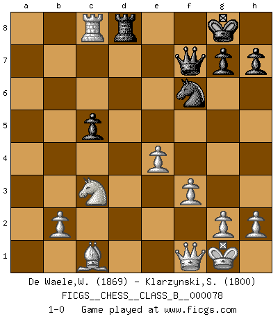 Last move : 1-0 2009 September 10 21:54:17 [Event "FICGS__CHESS__CLASS_B__000078"] [Site "FICGS"] [Date "2009.06.17"] [Round "1"] [White "De Waele,Willy"] [Black "Klarzynski,Slawomir"] [Result "1-0"] [WhiteElo "1869"] [BlackElo "1800"] 1.e4 e5 2.Nf3 Nc6 3.Bb5 a6 4.Ba4 Nf6 5.O-O b5 6.Bb3 Bc5 7.a4 Rb8 8.c3 d6 9.d4 Bb6 10.Na3 O-O 11.axb5 axb5 12.Nxb5 exd4 13.cxd4 Bg4 14.Ra4 Qe8 15.Qd3 Bd7 16.Nc3 Bxd4 17.Nxd4 Nxd4 18.Bxf7+ Qxf7 19.Rxd4 Be6 20.f3 c5 21.Rxd6 Bc4 22.Qd1 Bxf1 23.Qxf1 Rfd8 24.Rc6 Rbc8 25.Rxc8 1-0 Ruy Lopez : 5.O-O Kingside Castling by player White (move 5) Kingside Castling by player Black (move 10) Player White won this chess game. Follow this game move after move (download)Chess is everything: art, science and sport. (Anatoly Karpov) Ich spiele ehrlich und spiele, um zu gewinnen. Wenn ich verliere nehme ich meine Medizin. (Robert James Fischer) El Ajedrez detiene a su maestro dentro de sus propios vínculos, encadenando la mente y el cerebro, por lo que la libertad interior del mas fuerte debe sufrir. (Albert Einstein) La menace est plus forte que l'exécution. (Aaron Nimzovitch) Hardware: the parts of a computer that can be kicked. (Jeff Persis)