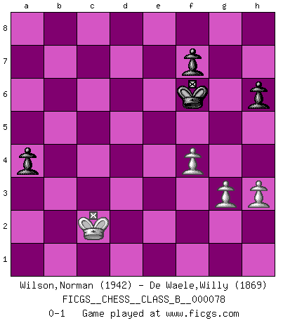 Last move : 0-1 2009 August 9 13:6:28 [Event "FICGS__CHESS__CLASS_B__000078"] [Site "FICGS"] [Date "2009.06.17"] [Round "1"] [White "Wilson,Norman"] [Black "De Waele,Willy"] [Result "0-1"] [WhiteElo "1942"] [BlackElo "1869"] 1.d4 d5 2.Nf3 Nf6 3.c4 c6 4.Nc3 e6 5.e3 Nbd7 6.Qc2 Bd6 7.Be2 O-O 8.O-O dxc4 9.Bxc4 a6 10.Rd1 b5 11.Bf1 Qc7 12.e4 e5 13.h3 Bb7 14.dxe5 Nxe5 15.Nd4 Ned7 16.g3 g6 17.a3 Rfe8 18.Bg2 Rad8 19.Bg5 Be7 20.Bf4 Qb6 21.Be3 c5 22.Nde2 Qc7 23.b3 Bf8 24.Bf4 Qc8 25.Rac1 c4 26.b4 h6 27.Bd6 Qa8 28.a4 bxa4 29.Bxf8 Rxf8 30.Rd6 Kg7 31.f4 a3 32.Rd4 Nb6 33.Qd2 Rxd4 34.Qxd4 Qd8 35.Qc5 Nbd7 36.Qxc4 Qb6+ 37.Qd4 Qxd4+ 38.Nxd4 Rb8 39.Ra1 Nxe4 40.Nxe4 Bxe4 41.Bxe4 Rxb4 42.Nf5+ gxf5 43.Bxf5 Nc5 44.Rxa3 Rb3 45.Rxb3 Nxb3 46.Kf2 a5 47.Bc2 a4 48.Ke2 Nd4+ 49.Kd3 Nxc2 50.Kxc2 Kf6 0-1 Queen's pawn game Kingside Castling by player Black (move 7) Kingside Castling by player White (move 8) 10 pieces endgame at move 45 : White KBPPP , Black KNPPP WHITE : King + 1 Bishop 3 Pawns BLACK : King + 1 Knight 3 Pawns 9 pieces endgame at move 49 : White KPPP , Black KNPPP WHITE : King + 3 Pawns BLACK : King + 1 Knight 3 Pawns 8 pieces endgame at move 50 : White KPPP , Black KPPP WHITE : King + 3 Pawns BLACK : King + 3 Pawns Player Black won this chess game. Follow this game move after move (download)One of these modest little moves may be more embarrassing to your opponent than the biggest threat. (Siegbert Tarrasch) Wie ich sie so einen nach dem anderen nieder mähte wurde meine Überlegenheit offensichtlich. (José Raúl Capablanca) Algunos sacrificios son sólidos, los demás son míos. (Mikhail Tal) En blitz, le Cavalier l'emporte sur le Fou. (Vlastimil Hort) The obstacle is the path. (Zen proverb)