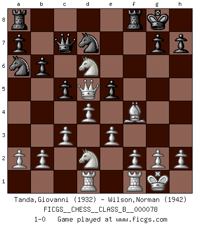 Last move : 1-0 2009 August 12 8:44:53 [Event "FICGS__CHESS__CLASS_B__000078"] [Site "FICGS"] [Date "2009.06.17"] [Round "1"] [White "Tanda,Giovanni"] [Black "Wilson,Norman"] [Result "1-0"] [WhiteElo "1932"] [BlackElo "1942"] 1.d4 Nf6 2.Bf4 e6 3.e3 d5 4.Nf3 Bd6 5.Ne5 O-O 6.Nd2 c5 7.c3 Qc7 8.Bd3 b6 9.O-O Ba6 10.Bxa6 Nxa6 11.Qf3 Rfd8 12.Rad1 Nd7 13.Nxf7 Rf8 14.Nxd6 e5 15.Qxd5+ 1-0 Queen's pawn game Kingside Castling by player Black (move 5) Kingside Castling by player White (move 9) Player White won this chess game. Follow this game move after move (download)Play the opening like a book, the middle game like a magician, and the endgame like a machine. (Spielmann) Ich hatte Zahnschmerzen im ersten Spiel. In der zweiten Partie tat mir der Kopf weh. In der dritten war es eine Rheuma-Attacke und während der vierten fühlte ich mich nicht gut. Und in der fünften? Nun, man muss doch nicht jedes Spiel gewinnen, oder? (Savielly Grigorievitsch Tartakower) Cuando tu casa esta en llamas, no puedes ser molestado por tus vecinos. O, como decinos en Ajedrez, si tu Rey esta bajo ataque, no te preocupa perder un Peón del lado de la Reina. (Gary Kasparov) Si je n'étais pas joueur d'échecs, je serais le meilleur dans quelque chose d'autre. (Anatoli Karpov) The Internet is the first thing that humanity has build that humanity doesn't understand, the largest experiment in anarchy that we have ever had. (Eric Schmidt)
