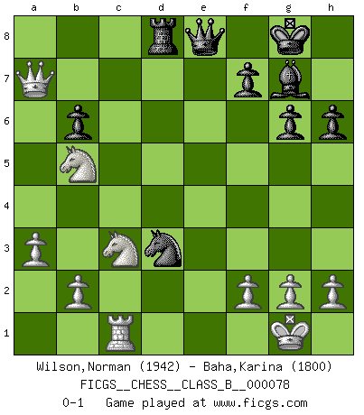 Last move : 0-1 2009 November 12 8:28:29 [Event "FICGS__CHESS__CLASS_B__000078"] [Site "FICGS"] [Date "2009.06.17"] [Round "1"] [White "Wilson,Norman"] [Black "Baha,Karina"] [Result "0-1"] [WhiteElo "1942"] [BlackElo "1800"] 1.d4 Nf6 2.Nf3 d5 3.c4 e6 4.Nc3 c6 5.Bg5 h6 6.Bxf6 Qxf6 7.e3 Nd7 8.Bd3 dxc4 9.Bxc4 g6 10.O-O Bg7 11.Qb3 Qe7 12.Bd3 O-O 13.Rac1 Rd8 14.Rfd1 b6 15.Qa4 Bb7 16.Ba6 Bxa6 17.Qxa6 c5 18.a3 e5 19.Qb7 exd4 20.exd4 cxd4 21.Nxd4 Qe8 22.Ndb5 Nc5 23.Rxd8 Rxd8 24.Qxa7 Nd3 0-1 Queen's pawn game Kingside Castling by player White (move 10) Kingside Castling by player Black (move 12) Player Black won this chess game. Follow this game move after move (download)Everything is in a state of flux, and this includes the world of Chess. (Mikhail Botvinnik) Die starken Figuren des Gegners muss man abtauschen. (José Raúl Capablanca) Ciertamente el estado mental actual de Bobby Fischer es una tragedia. Uno de los mas grandes jugadores de Ajedrez del mundo -el orgullo y pena del Ajedrez Americano. (Frank Brady) Les pièces de l'échiquier étaient impitoyables. Elles le retenaient, elles l'absorbaient. Il y avait de l'horreur en cela, mais aussi une harmonie unique. Car, qu'y a-t-il dans le monde, à part les échecs ? (V. Nabokov) Faith : not wanting to know what is true. (Friedrich Nietzsche)