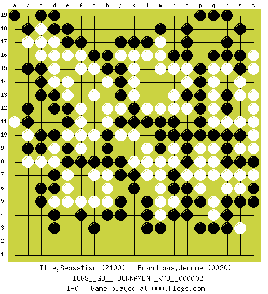 Last move : 1-0 2006 November 13 22:44:36 [Event "FICGS__GO__TOURNAMENT_KYU__000002"] [Site "FICGS"] [Date "2006.09.14"] [Round "1"] [Black "Ilie,Sebastian"] [White "Brandibas,Jerome"] [Result "1-0"] [Rating 1 "2100"] [Rating 2 "0020"] 1.r16 q4 2.d3 d16 3.c5 q15 4.q16 p16 5.p15 o15 6.p14 q14 7.o16 p17 8.o17 o14 9.p13 p18 10.o18 q17 11.r17 r18 12.p19 q18 13.s18 q13 14.p12 q12 15.p11 q11 16.q10 r11 17.r10 s11 18.s10 t10 19.s8 r15 20.s15 s14 21.s16 t15 22.r19 t16 23.q19 q8 24.r13 s13 25.t14 t13 26.t11 t12 27.r12 s9 28.r9 t9 29.t8 t11 30.r8 p9 31.p10 p7 32.c14 d14 33.d13 e14 34.c15 c16 35.f17 f16 36.e17 d17 37.g16 f15 38.o4 g15 39.h16 e13 40.d12 g13 41.q3 d11 42.e12 f11 43.e11 e10 44.d10 c11 45.e9 f10 46.c10 c12 47.c13 b10 48.b9 a11 49.b12 f9 50.e8 d9 51.c9 f12 52.f8 d8 53.d7 e6 54.g8 e7 55.d6 k16 56.j15 k15 57.j14 m15 58.j17 j16 59.h15 k13 60.j13 j12 61.k12 l12 62.k11 k14 63.l11 m12 64.k17 l16 65.m11 n12 66.j11 h12 67.l17 m17 68.n16 m16 69.m18 n15 70.n7 n9 71.n11 o12 72.o13 n13 73.n10 c8 74.r4 q5 75.p3 b8 76.b11 e5 77.d4 d5 78.c6 g5 79.g3 h5 80.j4 m4 81.j5 h6 82.j8 l8 83.k7 l7 84.k6 h11 85.h10 g10 86.h9 h14 87.d18 c18 88.e18 e16 89.c19 b19 90.d19 d15 91.b18 b17 92.c17 r7 93.r5 r6 94.o6 o7 95.n6 p6 96.o8 n8 97.o9 p8 98.o10 g7 99.f4 f5 100.h4 k8 101.j7 h7 102.h8 m7 103.m9 m8 104.n4 l9 105.m10 m6 106.m3 c18 107.a19 c17 108.b15 n5 109.o5 m5 110.l3 k10 111.l4 j10 112.l5 s7 113.s5 s3 114.r3 t7 115.t6 s6 116.t5 q9 117.q6 q7 118.p5 1-0 Here are the names of the openings (joseki) played in the four corners : Corner q16 : r16 q15 Komoku (Somok, Xiao~mu`) 3-4 Point. The komoku (3-4) point is the traditional corner enclosure move.. Corner q4 : q4 s8 Hoshi (Hwajeom, Seongjeom, Xingwei`) 4-4 Point. The star or hoshi (4-4) point, emphasizing influence at the potential expense of territory. Corner d16 : d16 c14 Hoshi (Hwajeom, Seongjeom, Xingwei`) 4-4 Point. The star or hoshi (4-4) point, emphasizing influence at the potential expense of territory. Ikken Kakari (Hankan Keolch'im, Yi Gua`jiao~, 1-Space Low Approach). Black 2 is the standard approach move to the 4-4. Player Black won this Go (weiqi, baduk) game. Follow this game move after move (download)Learning josekis by heart is useless if you don't try departing from them. (Pierre Audouard) Go and wake up your luck. (Persian saying)
