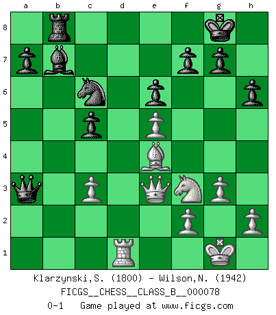 Last move : 0-1 2009 September 11 22:1:5 [Event "FICGS__CHESS__CLASS_B__000078"] [Site "FICGS"] [Date "2009.06.17"] [Round "1"] [White "Klarzynski,Slawomir"] [Black "Wilson,Norman"] [Result "0-1"] [WhiteElo "1800"] [BlackElo "1942"] 1.c4 e6 2.d4 Nf6 3.Nf3 b6 4.Nc3 Bb7 5.a3 d5 6.cxd5 Nxd5 7.Qc2 Nxc3 8.bxc3 Be7 9.e4 O-O 10.Bd3 c5 11.O-O Qc8 12.Qe2 Qc7 13.g3 Bd6 14.Be3 Nc6 15.dxc5 Bxc5 16.Bxc5 bxc5 17.Rab1 Rab8 18.Qe3 Rfd8 19.Rfd1 Qa5 20.e5 h6 21.Be4 Rxd1+ 22.Rxd1 Qxa3 0-1 English Opening Kingside Castling by player Black (move 9) Kingside Castling by player White (move 11) Player Black won this chess game. Follow this game move after move (download)Not only will I predict his triumph over Botvinnik, but I'll go further and say that he'll probably be the greatest Chess player that ever lived. (John Collins) Das typische an einem Großmeister ist, daß er eine gewonnene Position schnell und schmerzlos gewinnt. (Irving Chernev) Aquellos que dicen que entienden al Ajedrez, no entienden nada. (Robert Hubner) Le moment que je préfère le plus dans une rencontre, c'est celui où je sens que la personnalité de l'adversaire se brise. (Robert Fischer) Whatever you do, don't be bored. This is absolutely the most exciting time we could have possibly hoped to be alive. And things are just starting. (From movie Waking life)