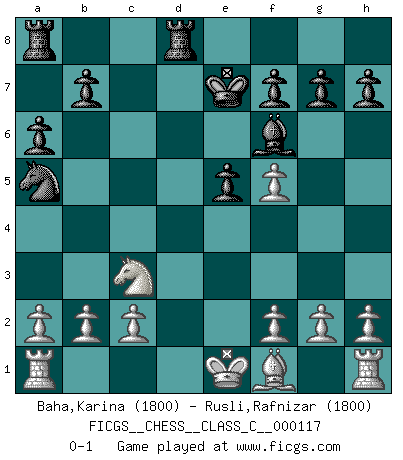 Last move : 0-1 2009 December 27 20:7:7 [Event "FICGS__CHESS__CLASS_C__000117"] [Site "FICGS"] [Date "2009.06.17"] [Round "1"] [White "Baha,Karina"] [Black "Rusli,Rafnizar"] [Result "0-1"] [WhiteElo "1800"] [BlackElo "1800"] 1.e4 c5 2.Nf3 Nc6 3.d4 cxd4 4.Nxd4 e5 5.Nb5 d6 6.N1c3 a6 7.Na3 Nf6 8.Bg5 Be7 9.Nc4 Be6 10.Bxf6 Bxf6 11.Nxd6+ Ke7 12.Nf5+ Bxf5 13.exf5 Qa5 14.Qd5 Rhd8 15.Qxa5 Nxa5 0-1 This chess game has been lost on time (started : 2009.06.17 11:13:56) Sicilian : Labourdonnais-Loewenthal (Kalashnikov) variation Player Black won this chess game. Follow this game move after move (download)Your body has to be in top condition. Your Chess deteriorates as your body does. You can't separate body from mind. (Bobby Fischer) In der Schule lernt man nichts. Es ist nur Zeitverschwendung. (Robert James Fischer) Vive, pierde y aprende al observar a tu oponente como ganar. (Amber Steenbock) Les Cavaliers se révèlent fort utiles dans les positions fermées. D'habitude, les Fous sont un peu plus forts que les Cavaliers dans les positions ouvertes. Qu'on le veuille ou non, il restera toujours des exceptions ! Real knowledge is to know the extent of one's ignorance. (Confucius)