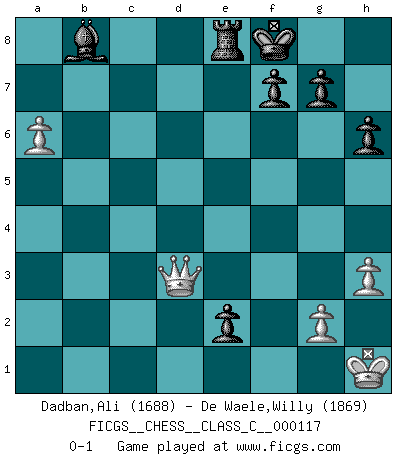 Last move : 0-1 2009 July 31 11:5:45 [Event "FICGS__CHESS__CLASS_C__000117"] [Site "FICGS"] [Date "2009.06.17"] [Round "1"] [White "Dadban,Ali"] [Black "De Waele,Willy"] [Result "0-1"] [WhiteElo "1688"] [BlackElo "1869"] 1.e4 c5 2.Nf3 d6 3.d4 cxd4 4.Nxd4 Nf6 5.Nc3 a6 6.Be2 e5 7.Nb3 Be7 8.O-O O-O 9.Kh1 b6 10.f3 Bb7 11.Be3 b5 12.a3 Qc7 13.Qd2 Nbd7 14.Rfd1 Rad8 15.Qe1 h6 16.Qf2 Nc5 17.Rac1 Rfe8 18.Nd5 Nxd5 19.exd5 Na4 20.c4 Nxb2 21.Rd2 Nxc4 22.Bxc4 bxc4 23.Bb6 Qb8 24.Bxd8 Bxd8 25.Rxc4 Qa8 26.Rdc2 a5 27.Nd2 Bxd5 28.Rc8 Qb7 29.Ne4 Bxe4 30.fxe4 Qxe4 31.h3 Qb7 32.R2c7 Qxc7 33.Rxc7 Bxc7 34.Qa7 Bb8 35.Qxa5 e4 36.Qb5 Kf8 37.a4 e3 38.Qe2 d5 39.a5 d4 40.a6 d3 41.Qxd3 e2 0-1 Sicilian : Najdorf, Opovcensky variation Kingside Castling by player White (move 8) Kingside Castling by player Black (move 8) Player Black won this chess game. Follow this game move after move (download)Chess is in its essence a game, in its form an art, and in its execution a science. (Baron Tassilo) Zum Sieg gelangt man nicht, wenn man gut, sondern nur wenn man besser spielt (Savielly Grigorievitsch Tartakower) En partidas rápidas, el Caballo es mas poderoso que el Alfil. (Vlastimil Hort) On croit qu'il y a plus de mauvais joueurs que de bons joueurs, c'est faux : Il y a autant de joueurs qui gagnent que de joueurs qui perdent. (Philippe Geluck) The weakness of an artist is dogma. (Josh Waitzkin)