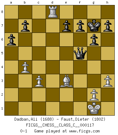 Last move : 0-1 2009 August 25 11:21:31 [Event "FICGS__CHESS__CLASS_C__000117"] [Site "FICGS"] [Date "2009.06.17"] [Round "1"] [White "Dadban,Ali"] [Black "Faust,Dieter"] [Result "0-1"] [WhiteElo "1688"] [BlackElo "1802"] 1.e4 c5 2.Nf3 Nc6 3.Nc3 g6 4.d4 cxd4 5.Nxd4 Bg7 6.Be3 Nf6 7.Bc4 Ne5 8.Be2 d6 9.h3 O-O 10.Qd2 Qc7 11.O-O-O Bd7 12.f4 Nc4 13.Bxc4 Qxc4 14.e5 dxe5 15.fxe5 Nd5 16.Nxd5 Qxd5 17.Nf3 Qxa2 18.Qxd7 Rad8 19.Qxd8 Qa1+ 20.Kd2 Rxd8+ 21.Ke2 Rxd1 22.Rxd1 Qa5 23.b4 Qc7 24.c3 Bxe5 25.Nxe5 Qxe5 26.Rd8+ Kg7 27.Kf2 Qf5+ 28.Kg1 a6 0-1 Sicilian defense Kingside Castling by player Black (move 9) Queenside Castling by player White (move 11) Player Black won this chess game. Follow this game move after move (download)Of Chess it has been said that life is not long enough for it, but that is the fault of life, not Chess. (William Ewart Napier) Als ich elf wurde, wurde ich einfach gut. (Robert James Fischer) El Ajedrez es imaginación. (David Bronstein) Aux échecs, l'amour-propre est satisfait quand on remporte la victoire, mais il n'y a pas de honte à être battu. (Benjamin Franklin) All the troubles of the world come from being unable to sit alone in a quiet room. (Blaise Pascal)