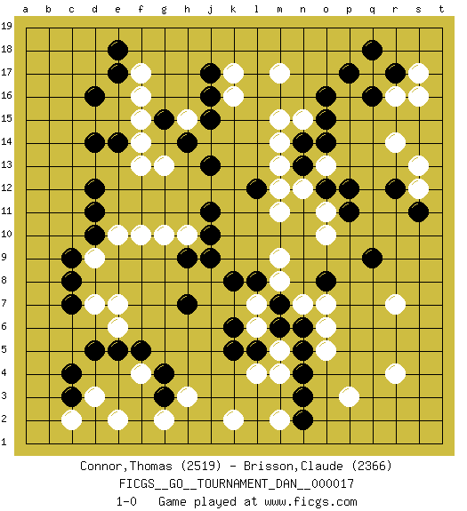 Last move : 1-0 2009 November 27 11:41:7 [Event "FICGS__GO__TOURNAMENT_DAN__000017"] [Site "FICGS"] [Date "2009.06.19"] [Round "1"] [Black "Connor,Thomas"] [White "Brisson,Claude"] [Result "1-0"] [Rating 1 "2519"] [Rating 2 "2366"] 1.q16 d3 2.d5 f4 3.c3 c2 4.c4 e2 5.c8 p3 6.d16 f17 7.d14 r14 8.o16 m17 9.j17 q17 10.p17 r16 11.r17 s17 12.q18 s16 13.e17 f16 14.j15 g13 15.j13 f13 16.d12 m15 17.j11 f10 18.d10 h10 19.j10 m13 20.h9 g10 21.j9 d9 22.c9 e10 23.d11 e7 24.n14 m14 25.o12 n15 26.o15 o13 27.n13 n12 28.o14 o11 29.p12 m11 30.l12 m12 31.g15 f15 32.p11 o10 33.r12 s12 34.s11 s13 35.q9 r4 36.o8 m9 37.h7 d7 38.m7 k16 39.j16 k17 40.c7 l7 41.l8 m8 42.m6 l6 43.k8 m5 44.l5 n7 45.n6 o7 46.k6 o6 47.n5 o5 48.n4 r7 49.f5 m4 50.n3 l4 51.k5 m2 52.n2 k2 53.g4 h3 54.g3 g2 55.e14 f14 56.e18 e6 57.e5 h15 58.h14 1-0 Here are the names of the openings (joseki) played in the four corners : Corner d4 : d3 d5 Komoku (Somok, Xiao~mu`) 3-4 Point. The komoku (3-4) point is the traditional corner enclosure move.. Ikken Takagakari (Hankan Nop'dakeolch'im, Yi Gaogua`jiao~, 1-Space High Approach). The 5-4 approach move has become more popular in modern times, as modern Go emphasizes speed and influence. Corner d16 : d16 f17 Hoshi (Hwajeom, Seongjeom, Xingwei`) 4-4 Point. The star or hoshi (4-4) point, emphasizing influence at the potential expense of territory. Ikken Kakari (Hankan Keolch'im, Yi Gua`jiao~, 1-Space Low Approach). White 2 is the standard approach move to the 4-4. Corner q16 : q16 r14 Hoshi (Hwajeom, Seongjeom, Xingwei`) 4-4 Point. The star or hoshi (4-4) point, emphasizing influence at the potential expense of territory. Ikken Kakari (Hankan Keolch'im, Yi Gua`jiao~, 1-Space Low Approach). White 2 is the standard approach move to the 4-4. Corner q4 : p3 q9 Mokuhazushi (Waemok, Wai`mu`) 5-3 Point. The mokuhazushi (5-3) point was popular in the Edo period in Japan (1600 - 1867). It emphasizes influence; territorially, it is inferior to the 3-4 point. Player Black won this Go (weiqi, baduk) game. Follow this game move after move (download)If your stone is capped, play the knight's move. (Anonymous) War is the child of passion, passion is the child of narcissism and narcissism is the child. (...) Another game ? (Thibault de Vassal)