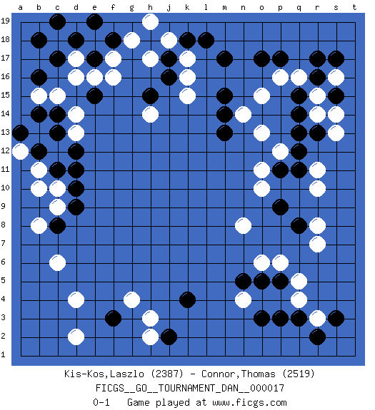 Last move : 0-1 2009 December 12 11:51:21 [Event "FICGS__GO__TOURNAMENT_DAN__000017"] [Site "FICGS"] [Date "2009.06.19"] [Round "1"] [Black "Kis-Kos,Laszlo"] [White "Connor,Thomas"] [Result "0-1"] [Rating 1 "2387"] [Rating 2 "2519"] 1.r16 d16 2.q3 d4 3.p17 q5 4.q8 n4 5.p5 p6 6.o5 q4 7.o3 r3 8.p3 o6 9.n5 r7 10.r2 r8 11.s3 r11 12.f3 c6 13.k4 k17 14.c14 b15 15.c11 f16 16.c8 d2 17.m17 k15 18.h15 h17 19.c17 d17 20.d18 e18 21.b16 c15 22.b18 d19 23.c19 c18 24.j16 k16 25.d18 h3 26.e19 g4 27.f18 f17 28.e17 d14 29.j2 h2 30.j17 j18 31.h18 g18 32.k18 h19 33.l18 h14 34.e15 e16 35.r13 c9 36.d9 c10 37.d10 b11 38.b12 c12 39.d11 b10 40.b14 b13 41.c13 a12 42.d12 d13 43.b12 b8 44.a13 s16 45.s17 r15 46.s15 q16 47.r17 s14 48.q15 r14 49.q14 s13 50.q13 p16 51.o17 o15 52.m15 o13 53.q11 r10 54.m13 p12 55.q12 n14 56.m14 o10 57.p11 o11 58.p9 n8 0-1 Here are the names of the openings (joseki) played in the four corners : Corner q4 : q3 q5 Komoku (Somok, Xiao~mu`) 3-4 Point. The komoku (3-4) point is the traditional corner enclosure move.. Ikken Takagakari (Hankan Nop'dakeolch'im, Yi Gaogua`jiao~, 1-Space High Approach). The 5-4 approach move has become more popular in modern times, as modern Go emphasizes speed and influence. Corner d4 : d4 f3 Hoshi (Hwajeom, Seongjeom, Xingwei`) 4-4 Point. The star or hoshi (4-4) point, emphasizing influence at the potential expense of territory. Ikken Kakari (Hankan Keolch'im, Yi Gua`jiao~, 1-Space Low Approach). Black 2 is the standard approach move to the 4-4. Corner d16 : d16 c14 Hoshi (Hwajeom, Seongjeom, Xingwei`) 4-4 Point. The star or hoshi (4-4) point, emphasizing influence at the potential expense of territory. Ikken Kakari (Hankan Keolch'im, Yi Gua`jiao~, 1-Space Low Approach). Black 2 is the standard approach move to the 4-4. Player White won this Go (weiqi, baduk) game. Follow this game move after move (download)Sacrifice for shape. (Anonymous) Information on the Internet is subject to the same rules and regulations as conversation at a bar. (George Lundberg)