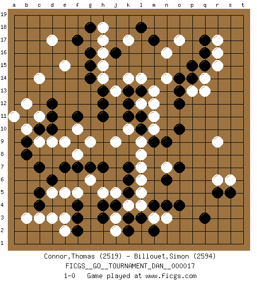 Last move : 1-0 2009 November 20 11:2:29 [Event "FICGS__GO__TOURNAMENT_DAN__000017 "] [Site "FICGS"] [Date "2009.06.19"] [Round "1"] [Black "Connor,Thomas "] [White "Billouet,Simon "] [Result "1-0"] [Rating 1 "2519"] [Rating 2 "2594"] 1.q16 d17 2.q3 d3 3.k3 r6 4.o4 r9 5.c5 c9 6.f4 e3 7.f3 d5 8.d6 e5 9.c4 c3 10.c7 e9 11.f7 g6 12.g7 f5 13.d10 d9 14.d12 c14 15.f11 g9 16.h7 j9 17.h11 j5 18.k7 k10 19.k12 m10 20.f17 e15 21.j16 o17 22.m17 q14 23.p14 p13 24.p15 r17 25.q17 r16 26.q15 r15 27.o13 q13 28.o10 b12 29.f2 b3 30.s5 s6 31.r5 l5 32.m4 h17 33.g16 h16 34.g15 h15 35.g14 h14 36.h13 j13 37.h12 k17 38.l18 l14 39.g18 m13 40.l13 l12 41.k13 k14 42.k11 n14 43.o14 n16 44.l11 h18 45.b11 c11 46.c10 b10 47.b9 a11 48.b8 m12 49.o12 m11 50.l10 l9 51.m9 l8 52.n9 l7 53.k6 l6 54.k5 l4 55.l3 k4 56.j4 j3 57.h4 h5 58.h3 e2 59.n6 m3 60.m2 n3 61.n4 j2 62.k2 n7 63.o7 f8 64.e7 f10 65.d11 1-0 Here are the names of the openings (joseki) played in the four corners : Corner q4 : q3 r6Komoku (Somok, Xiao~mu`) 3-4 Point. The komoku (3-4) point is the traditional corner enclosure move..Nikken Kakari (Dukan Keolch'im, E`r Gua`jiao~, 2-Space Low Approach). White 2 is used with friendly forces backing it up. Its purpose is to prevent a pincer. Locally it results in a loss, but may be appropriate fuseki strategy. It was popular in the late 1950s and early 1960s, but is not seen often nowadays, having been replaced by the one-space high approach, with which it has points in common. Corner d4 : d3 c5Komoku (Somok, Xiao~mu`) 3-4 Point. The komoku (3-4) point is the traditional corner enclosure move..Ikken Kakari (Hankan Keolch'im, Yi Gua`jiao~, 1-Space Low Pincer). The small knight move is the basic approach move to the 3-4 point stone. It has been continually used for over four centuries. There are limitless variations, with new moves constantly being discovered. Black 2 opens the door to a treaure store of joseki. Corner d16 : d17 d12Komoku (Somok, Xiao~mu`) 3-4 Point. The komoku (3-4) point is the traditional corner enclosure move.. Corner q16 : q16 o17Hoshi (Hwajeom, Seongjeom, Xingwei`) 4-4 Point. The star or hoshi (4-4) point, emphasizing influence at the potential expense of territory.Ikken Kakari (Hankan Keolch'im, Yi Gua`jiao~, 1-Space Low Approach). White 2 is the standard approach move to the 4-4. Player Black won this Go (weiqi, baduk) game.Follow this game move after move (download ) When in doubt, remove the enemy stones from the board. (Bill Taylor) There are more things in heaven and earth than practically anywhere else. (Unknown)