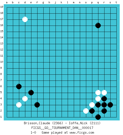 Last move : 1-0 2009 August 23 21:20:13 [Event "FICGS__GO__TOURNAMENT_DAN__000017"] [Site "FICGS"] [Date "2009.06.19"] [Round "1"] [Black "Brisson,Claude"] [White "Ioffe,Nick"] [Result "1-0"] [Rating 1 "2366"] [Rating 2 "2111"] 1.q16 d4 2.f3 p3 3.c6 c3 4.e5 d17 5.r4 r3 6.s3 q4 7.r2 r5 8.q3 q2 9.r3 q5 10.p2 o2 11.q1 1-0 This go game has been lost on time (started : 2009.06.19 17:48:31) Here are the names of the openings (joseki) played in the four corners : Corner d4 : d4 f3 Hoshi (Hwajeom, Seongjeom, Xingwei`) 4-4 Point. The star or hoshi (4-4) point, emphasizing influence at the potential expense of territory. Ikken Kakari (Hankan Keolch'im, Yi Gua`jiao~, 1-Space Low Approach). Black 2 is the standard approach move to the 4-4. Corner q4 : p3 r4 Mokuhazushi (Waemok, Wai`mu`) 5-3 Point. The mokuhazushi (5-3) point was popular in the Edo period in Japan (1600 - 1867). It emphasizes influence; territorially, it is inferior to the 3-4 point. Komoku Kakari. Black 2 is the standard approach because of its solidity and stability. Player Black won this Go (weiqi, baduk) game. Follow this game move after move (download)Be a little patient. Keshi works ! (Anonymous) All the biggest technological inventions created by man - the airplane, the automobile, the computer - says little about his intelligence, but speaks volumes about his laziness. (Mark Kennedy)