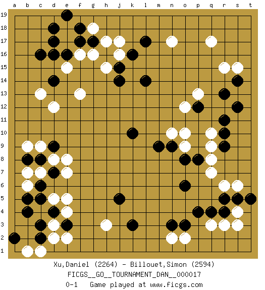 Last move : 0-1 2009 August 24 10:45:15 [Event "FICGS__GO__TOURNAMENT_DAN__000017"] [Site "FICGS"] [Date "2009.06.19"] [Round "1"] [Black "Xu,Daniel"] [White "Billouet,Simon"] [Result "0-1"] [Rating 1 "2264"] [Rating 2 "2594"] 1.q4 d3 2.c16 e17 3.d14 r15 4.g17 q17 5.l17 c7 6.k3 h3 7.n3 n17 8.d17 r6 9.r9 r3 10.r4 q3 11.p4 s4 12.s5 s3 13.r5 o2 14.o3 n2 15.j5 d5 16.l14 j17 17.k16 j16 18.j15 g16 19.f17 h15 20.j14 f16 21.e16 e18 22.f18 e15 23.d16 h17 24.d18 g18 25.e19 f13 26.k10 d12 27.r13 s6 28.t5 q9 29.r10 q7 30.p8 q8 31.o6 q10 32.r11 o10 33.n9 n10 34.m9 p13 35.s14 s15 36.s12 c13 37.p12 o9 38.o8 o12 39.c8 d8 40.d9 c9 41.b8 b9 42.d7 e8 43.c6 e7 44.b4 b7 45.c2 d2 46.c3 b6 47.a2 b1 48.d4 e4 49.c5 c4 50.b5 c1 51.d4 e5 52.e3 e2 0-1 Here are the names of the openings (joseki) played in the four corners : Corner d16 : c16 e17 Komoku (Somok, Xiao~mu`) 3-4 Point. The komoku (3-4) point is the traditional corner enclosure move.. Ikken Kakari (Hankan Keolch'im, Yi Gua`jiao~, 1-Space Low Pincer). The small knight move is the basic approach move to the 3-4 point stone. It has been continually used for over four centuries. There are limitless variations, with new moves constantly being discovered. White 2 opens the door to a treaure store of joseki. Player White won this Go (weiqi, baduk) game. Follow this game move after move (download)If you don't know ladders, don't play go. (Anonymous) Mandala - that's it! 16x16 squares as multiple of the four and the eight because of the Four Noble Truths and the Noble Eightfold Path. (Heinz-Georg Lehnhoff about Big Chess)