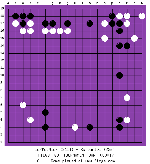 Last move : 0-1 2009 August 19 20:59:42 [Event "FICGS__GO__TOURNAMENT_DAN__000017"] [Site "FICGS"] [Date "2009.06.19"] [Round "1"] [Black "Ioffe,Nick"] [White "Xu,Daniel"] [Result "0-1"] [Rating 1 "2111"] [Rating 2 "2264"] 1.q16 d4 2.q4 d16 3.q10 o17 4.m17 o15 5.q14 r17 6.q17 q18 7.p18 r18 8.p17 s15 9.r14 t18 10.f3 k3 11.m3 c6 12.f5 r4 13.q3 r7 14.f17 g16 15.c17 d17 16.d18 c16 17.b18 b17 18.c18 f16 19.g17 h16 20.j17 j16 0-1 This go game has been lost on time (started : 2009.06.19 17:48:31) Here are the names of the openings (joseki) played in the four corners : Corner q16 : q16 o17 Hoshi (Hwajeom, Seongjeom, Xingwei`) 4-4 Point. The star or hoshi (4-4) point, emphasizing influence at the potential expense of territory. Ikken Kakari (Hankan Keolch'im, Yi Gua`jiao~, 1-Space Low Approach). White 2 is the standard approach move to the 4-4. Corner d4 : d4 f3 Hoshi (Hwajeom, Seongjeom, Xingwei`) 4-4 Point. The star or hoshi (4-4) point, emphasizing influence at the potential expense of territory. Ikken Kakari (Hankan Keolch'im, Yi Gua`jiao~, 1-Space Low Approach). Black 2 is the standard approach move to the 4-4. Corner d16 : d16 f17 Hoshi (Hwajeom, Seongjeom, Xingwei`) 4-4 Point. The star or hoshi (4-4) point, emphasizing influence at the potential expense of territory. Ikken Kakari (Hankan Keolch'im, Yi Gua`jiao~, 1-Space Low Approach). Black 2 is the standard approach move to the 4-4. Player White won this Go (weiqi, baduk) game. Follow this game move after move (download)Studying go is a wonderful way to develop both the creative as well as the logical abilities of children because to play it both sides of the brain are necessary. (Cho Chikun) The leaves of memory seemed to make a mournful rustling in the dark. (Henry Wadsworth Longfellow)