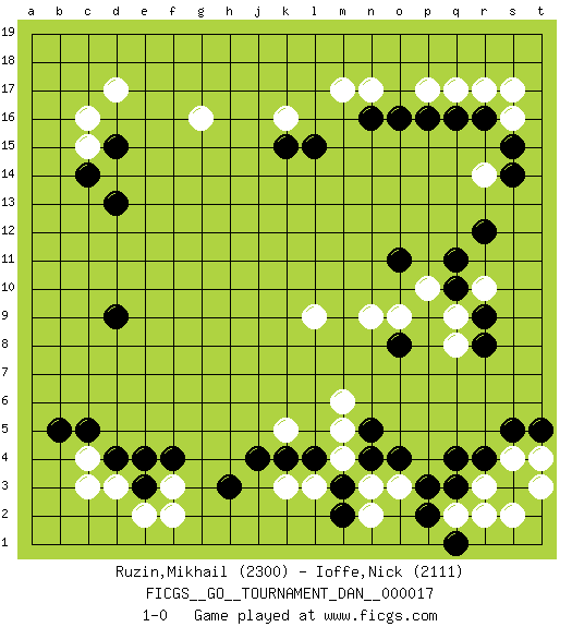Last move : 1-0 2009 September 6 22:16:42 [Event "FICGS__GO__TOURNAMENT_DAN__000017"] [Site "FICGS"] [Date "2009.06.19"] [Round "1"] [Black "Ruzin,Mikhail"] [White "Ioffe,Nick"] [Result "1-0"] [Rating 1 "2300"] [Rating 2 "2111"] 1.q16 d17 2.q4 r10 3.d4 k3 4.d15 c15 5.c14 c16 6.d13 g16 7.d9 o3 8.p3 r3 9.r4 s4 10.s5 q2 11.q3 s2 12.p2 t3 13.q1 r2 14.t5 t4 15.r8 r14 16.r12 r17 17.r16 s16 18.s15 s17 19.s14 q17 20.p16 p17 21.o16 n17 22.n16 m17 23.l15 k16 24.k15 q8 25.r9 q9 26.q10 p10 27.q11 n9 28.o8 o9 29.o11 l9 30.h3 k5 31.m3 m4 32.n4 m5 33.n5 m6 34.j4 f3 35.f4 d3 36.e3 c4 37.c5 c3 38.b5 e2 39.e4 f2 40.k4 l3 41.l4 n3 42.m2 n2 43.o4 1-0 This go game has been lost on time (started : 2009.06.19 17:48:31) Here are the names of the openings (joseki) played in the four corners : Corner d16 : d17 d15 Komoku (Somok, Xiao~mu`) 3-4 Point. The komoku (3-4) point is the traditional corner enclosure move.. Ikken Takagakari (Hankan Nop'dakeolch'im, Yi Gaogua`jiao~, 1-Space High Approach). The 5-4 approach move has become more popular in modern times, as modern Go emphasizes speed and influence. Corner q4 : q4 o3 Hoshi (Hwajeom, Seongjeom, Xingwei`) 4-4 Point. The star or hoshi (4-4) point, emphasizing influence at the potential expense of territory. Ikken Kakari (Hankan Keolch'im, Yi Gua`jiao~, 1-Space Low Approach). White 2 is the standard approach move to the 4-4. Corner q16 : q16 r14 Hoshi (Hwajeom, Seongjeom, Xingwei`) 4-4 Point. The star or hoshi (4-4) point, emphasizing influence at the potential expense of territory. Ikken Kakari (Hankan Keolch'im, Yi Gua`jiao~, 1-Space Low Approach). White 2 is the standard approach move to the 4-4. Player Black won this Go (weiqi, baduk) game. Follow this game move after move (download)Keshi is worth as much as an invasion ! (Anonymous) Tree pose grows confidence. It roots me to this world. (Terri Guillemets)
