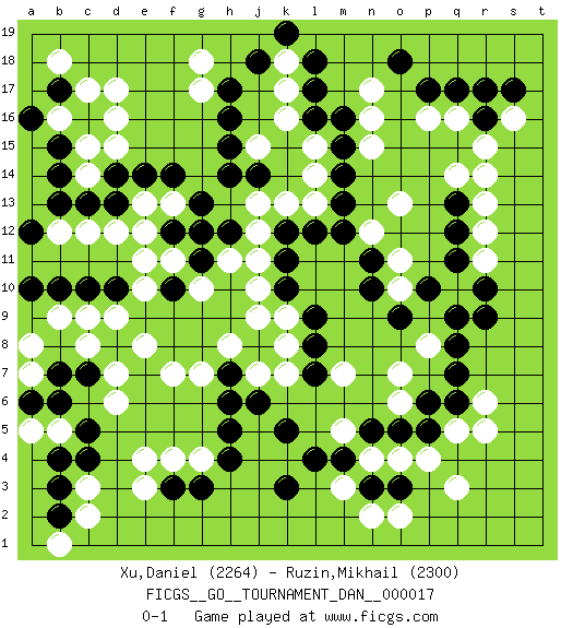 Last move : 0-1 2009 September 11 15:18:9 [Event "FICGS__GO__TOURNAMENT_DAN__000017"] [Site "FICGS"] [Date "2009.06.19"] [Round "1"] [Black "Xu,Daniel"] [White "Ruzin,Mikhail"] [Result "0-1"] [Rating 1 "2264"] [Rating 2 "2300"] 1.r16 d16 2.c4 q3 3.p17 r5 4.k3 m3 5.k5 e4 6.g3 g4 7.f3 e3 8.h4 f4 9.h5 c3 10.c7 f7 11.c10 q10 12.q12 k16 13.c16 d17 14.c13 c15 15.h16 n16 16.h14 r14 17.r10 r11 18.q11 r12 19.q13 r13 20.r9 q14 21.p10 m5 22.q9 s16 23.s17 q16 24.q17 r15 25.r17 g17 26.h17 g18 27.l16 l15 28.l17 j15 29.h15 k17 30.l18 n17 31.m15 n15 32.m14 l14 33.m13 p16 34.j18 l13 35.l12 j13 36.k12 j12 37.k10 g12 38.f14 e13 39.m16 o13 40.b15 c14 41.b14 b16 42.b3 c2 43.o5 n12 44.m12 k18 45.k19 o7 46.q6 q5 47.p6 r6 48.o3 o2 49.n11 o11 50.n10 o10 51.o9 p8 52.q8 o6 53.p5 m7 54.n3 n2 55.m4 n4 56.l4 o4 57.n5 p4 58.q7 k7 59.j8 j7 60.h7 h8 61.j6 g7 62.h6 j9 63.l8 k9 64.l9 k8 65.l7 c8 66.b7 c9 67.b10 b9 68.b2 c12 69.d14 d15 70.d13 d12 71.e14 b12 72.d10 e8 73.f12 f13 74.g13 e12 75.h12 f11 76.j14 k13 77.g11 h11 78.f12 j10 79.k11 g12 80.d8 d9 81.f12 j11 82.f10 e11 83.g12 g10 84.b13 e10 85.a10 a8 86.a12 b5 87.c5 a7 88.a6 b1 89.b4 d7 90.b6 d6 91.b17 c17 92.a16 b18 93.o18 a5 0-1 Here are the names of the openings (joseki) played in the four corners : Corner d4 : c4 e4 Komoku (Somok, Xiao~mu`) 3-4 Point. The komoku (3-4) point is the traditional corner enclosure move.. Ikken Takagakari (Hankan Nop'dakeolch'im, Yi Gaogua`jiao~, 1-Space High Approach). The 5-4 approach move has become more popular in modern times, as modern Go emphasizes speed and influence. Corner d16 : d16 c16 Hoshi (Hwajeom, Seongjeom, Xingwei`) 4-4 Point. The star or hoshi (4-4) point, emphasizing influence at the potential expense of territory. Player White won this Go (weiqi, baduk) game. Follow this game move after move (download)Nothing requires doing this or that, but necessity exists. (Pierre Audouard) Life is like internet, nothing interesting, but noone want to leave it. (Ilmars Cirulis)