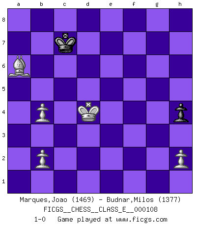 Last move : 1-0 2009 September 24 7:39:25 [Event "FICGS__CHESS__CLASS_E__000108"] [Site "FICGS"] [Date "2009.06.20"] [Round "1"] [White "Marques,Joao"] [Black "Budnar,Milos"] [Result "1-0"] [WhiteElo "1469"] [BlackElo "1377"] 1.e4 e5 2.Nf3 Nf6 3.Nxe5 Bd6 4.Nf3 Nxe4 5.Qe2 Qe7 6.d3 O-O 7.Qxe4 Qxe4 8.dxe4 Nc6 9.Nc3 Bb4 10.Bd2 d6 11.Bd3 Bg4 12.Be2 Rae8 13.O-O Bxc3 14.Bxc3 Rxe4 15.Bd3 Re7 16.Nd4 Bd7 17.Rfe1 Rfe8 18.Rxe7 Nxe7 19.Re1 Kf8 20.Nb5 Bxb5 21.Bxb5 c6 22.Bd3 g6 23.Bf6 d5 24.Bxe7+ Rxe7 25.Rxe7 Kxe7 26.Kf1 b5 27.f4 h5 28.Kf2 a6 29.Ke3 c5 30.g3 c4 31.Be2 Kd6 32.Kd4 b4 33.Bf3 b3 34.cxb3 cxb3 35.axb3 f6 36.Bxd5 g5 37.fxg5 fxg5 38.b4 h4 39.gxh4 gxh4 40.Bb7 Kc7 41.Bxa6 1-0 Petrov's defense Kingside Castling by player Black (move 6) Kingside Castling by player White (move 13) 10 pieces endgame at move 37 : White KBPPPP , Black KPPP WHITE : King + 1 Bishop 4 Pawns BLACK : King + 3 Pawns 9 pieces endgame at move 39 : White KBPPPP , Black KPP WHITE : King + 1 Bishop 4 Pawns BLACK : King + 2 Pawns 8 pieces endgame at move 39 : White KBPPP , Black KPP WHITE : King + 1 Bishop 3 Pawns BLACK : King + 2 Pawns 7 pieces endgame at move 41 : White KBPPP , Black KP WHITE : King + 1 Bishop 3 Pawns BLACK : King + 1 Pawn Player White won this chess game. Follow this game move after move (download)Winning isn't everything... but losing is nothing. (Mednis) Ich könnte leicht behaupten: Ja,ja, Leonid Breschnew wollte nicht, daß ich Weltmeister werde. In der Tat war die Sache komplizierter. (Viktor Kortschnoi) Bobby solo arroja las piezas y solas caen en las casillas correctas. (Miguel Najdorf ) Mais l'homme est une créature légère et illogique : semblable au joueur d'échecs, il n'aime que le processus du but à atteindre, non le but lui-même. (Dostoïevsky) Hold em is to stud what chess is to checkers. (Johnny Moss)