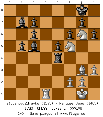 Last move : 1-0 2009 July 29 19:10:36 [Event "FICGS__CHESS__CLASS_E__000108"] [Site "FICGS"] [Date "2009.06.20"] [Round "1"] [White "Stoyanov,Zdravko"] [Black "Marques,Joao"] [Result "1-0"] [WhiteElo "1275"] [BlackElo "1469"] 1.e4 e5 2.Nf3 Nc6 3.Bb5 a6 4.Bxc6 dxc6 5.h3 Nf6 6.d3 Bd6 7.a3 O-O 8.Bg5 Qe7 9.O-O Qe6 10.Nbd2 h6 11.Bh4 Nh5 12.Nh2 Nf4 13.Bg3 Ng6 14.c4 b5 15.b4 Bb7 16.c5 Be7 17.Ndf3 a5 18.Ng4 axb4 19.axb4 f6 20.Rxa8 Rxa8 21.Qe2 Qb3 22.Qd2 Ra2 23.Qe1 Qxd3 24.Qe3 Qxe3 25.Nxe3 Rb2 26.Nf5 Rxb4 27.N3h4 Bxc5 28.Nxg6 Rxe4 29.Rd1 1-0 Ruy Lopez : Exchange variation Kingside Castling by player Black (move 7) Kingside Castling by player White (move 9) Player White won this chess game. Follow this game move after move (download)When the Chess game is over, the Pawn and the King go back to the same box. (Irish saying) Je mehr wir mit Computern analysieren, desto mehr glauben wir an Verteidigung. (Vladimir Kramnik) Jugadores de primera clase pierden en contra de jugadores de segunda clase porque los jugadores de segunda clase a veces juegan una partida de primer clase. (Siegbert Tarrasch) Les erreurs sont comme les malheurs, elles n'arrivent jamais seules. (Siegbert Tarrasch) Methinks King Thibault should dub Marius Zubac a knight of the square board... I mean table, henceforth addressing him as Sir Marius, and bestow on him a suitable land from the kingdom of FICGS & marry him off to a worthy, fair maiden, lest he slice our heads with his mighty sword in his wrath. (Dinesh De Silva)