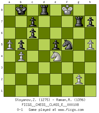 Last move : 0-1 2009 August 5 22:25:22 [Event "FICGS__CHESS__CLASS_E__000108"] [Site "FICGS"] [Date "2009.06.20"] [Round "1"] [White "Stoyanov,Zdravko"] [Black "Raman,Ranganathan"] [Result "0-1"] [WhiteElo "1275"] [BlackElo "1396"] 1.e4 e5 2.Nf3 Nc6 3.Bb5 Qf6 4.a3 Bc5 5.O-O Nh6 6.d3 a6 7.Bxc6 dxc6 8.Re1 Bd7 9.h3 O-O-O 10.Be3 Bxe3 11.Rxe3 Rhe8 12.Nbd2 g5 13.Nh2 Qg6 14.b4 b5 15.Rg3 f5 16.h4 g4 17.Nb3 fxe4 18.Nc5 Re7 19.Nxa6 Rf7 20.Nc5 Bf5 21.Qe2 exd3 22.cxd3 Qd6 23.a4 Qd4 24.Rb1 Rf6 25.Ne4 Bxe4 26.Qxe4 Qxf2+ 27.Kh1 Qxg3 28.a5 Nf5 29.Qxg4 Qxd3 30.Rf1 Kb8 31.Nf3 Qxf1+ 32.Ng1 Rg6 33.Qf3 Ng3+ 34.Kh2 Qxf3 35.Nxf3 Nf1+ 36.Kh3 Rd3 37.h5 Rh6 38.Kh4 Re3 39.Kg5 Rd6 40.Kf5 Ng3+ 41.Kg4 Ne2 42.Kf5 Rd5 43.Ng5 Nd4+ 44.Kf6 Rd6+ 45.Ke7 Nf5+ 46.Kf7 Rg3 47.Ne4 Rg7+ 48.Kf8 Rd8+ 0-1 Ruy Lopez (Spanish Opening) Kingside Castling by player White (move 5) Queenside Castling by player Black (move 9) Player Black won this chess game. Follow this game move after move (download)Avoid the crowd. Do your own thinking independently. Be the Chess player, not the Chess piece. (Ralph Charell) Modernes Schach erfordert enorme Anspannung. Es ist für einen normalen Menschen unmöglich das auszuhalten. (Viktor Kortschnoi) Un sacrificio se refuta mucho mejor al aceptarlo. (Wilhelm Steinitz) Les écrivains ont utilisé les échecs pour analyser les côtés extrêmes de la nature humaine. Dans ce cadre, les échecs offrent un champ d'expérimentation idéal. Mais on pourrait faire la même chose avec la peinture. Et là, en vous référant à Van Gogh, vous ne tirerez pas de conclusion définitive sur les peintres. (Gary Kasparov) Life is painting a picture, not doing a sum. (Oliver Wendell Holmes, Jr.)
