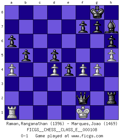 Last move : 0-1 2009 September 22 12:41:16 [Event "FICGS__CHESS__CLASS_E__000108"] [Site "FICGS"] [Date "2009.06.20"] [Round "1"] [White "Raman,Ranganathan"] [Black "Marques,Joao"] [Result "0-1"] [WhiteElo "1396"] [BlackElo "1469"] 1.Nf3 d5 2.Nd4 e5 3.Nb5 Nf6 4.e3 Nc6 5.c3 a6 6.N5a3 Be7 7.h3 O-O 8.d4 Bf5 9.Nd2 Bxa3 10.bxa3 e4 11.g4 Bg6 12.f4 h6 13.h4 Bh7 14.Be2 Qd7 15.Nb3 b5 16.Nc5 Qe7 17.Kd2 Na5 18.Rh3 Nd7 19.Qh1 Nxc5 20.Bb2 Na4 21.Bc1 c5 22.Qd1 cxd4 23.cxd4 Rac8 24.Ke1 Nc3 25.Qd2 Nxe2 26.Kxe2 Nc4 27.Qd1 Nxa3 28.Bxa3 Qxa3 29.Qd2 Rc3 30.h5 Rfc8 31.Kd1 Rd3 32.Qxd3 Qxd3+ 33.Ke1 Rc2 34.Rh2 Qxe3+ 35.Kf1 Rxh2 36.a4 Qf2+ 0-1 Reti Opening Kingside Castling by player Black (move 7) Player Black won this chess game. Follow this game move after move (download)The blunders are all there on the board, waiting to be made. (Savielly Tartakover) Der zweitbeste Zug ist oft der einzig richtige. (Savielly Grigorievitsch Tartakower) El Ajedrez te enseña a controlarl la excitación inicial que sientes cuando vez algo que parece bueno y te enseña a pensar objetivamente cuando te encuentras en problemas. (Stanley Kubrick) Seul un grand joueur sait à quel point il joue faiblement. (Xavier Tartacover) I just play for fun. (Anna Kournikova)