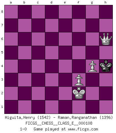 Last move : 1-0 2009 July 9 0:44:45 [Event "FICGS__CHESS__CLASS_E__000108"] [Site "FICGS"] [Date "2009.06.20"] [Round "1"] [White "Higuita,Henry"] [Black "Raman,Ranganathan"] [Result "1-0"] [WhiteElo "1542"] [BlackElo "1396"] 1.e4 e5 2.Nf3 Bd6 3.Bc4 Nf6 4.d3 Nc6 5.a3 h6 6.Nc3 a6 7.h3 Na5 8.Ba2 c6 9.b4 b5 10.bxa5 Qxa5 11.Bd2 Qxa3 12.Bxf7+ Kxf7 13.Rxa3 Bxa3 14.Nxe5+ Ke6 15.d4 Bb4 16.f3 Bd6 17.Ng6 Bg3+ 18.Ke2 Re8 19.Bf4 Nh5 20.Be3 d6 21.Qc1 Kf6 22.Nf4 Bxf4 23.Bxf4 d5 24.g4 Nxf4+ 25.Qxf4+ Ke7 26.exd5 Kd8 27.Kd2 Bd7 28.dxc6 Bxc6 29.Qd6+ Bd7 30.Nd5 Re6 31.Qc7+ Ke8 32.Re1 Rxe1 33.Kxe1 a5 34.Nb6 Rd8 35.Nxd7 Rxd7 36.Qxa5 Rxd4 37.Qxb5+ Rd7 38.Kf2 g5 39.c4 Kd8 40.c5 Rc7 41.c6 Kc8 42.Qf5+ Kb8 43.Qf8+ Ka7 44.Qxh6 Kb6 45.Qxg5 Rxc6 46.Qd8+ Kb5 47.h4 Kc5 48.h5 Rd6 49.Qxd6+ Kxd6 50.h6 Ke5 51.h7 Kf4 52.h8Q Kg5 53.Qf8 Kh4 54.Qh6+ 1-0 King's knight Opening 10 pieces endgame at move 37 : White KQPPPP , Black KRPP WHITE : King + 1 Queen 4 Pawns BLACK : King + 1 Rook 2 Pawns 9 pieces endgame at move 44 : White KQPPPP , Black KRP WHITE : King + 1 Queen 4 Pawns BLACK : King + 1 Rook 1 Pawn 8 pieces endgame at move 45 : White KQPPPP , Black KR WHITE : King + 1 Queen 4 Pawns BLACK : King + 1 Rook 7 pieces endgame at move 45 : White KQPPP , Black KR WHITE : King + 1 Queen 3 Pawns BLACK : King + 1 Rook 6 pieces endgame at move 49 : White KQPPP , Black K WHITE : King + 1 Queen 3 Pawns BLACK : King + 5 pieces endgame at move 49 : White KPPP , Black K WHITE : King + 3 Pawns BLACK : King + Promotion Queen by player White (move 52) Player White won this chess game. Follow this game move after move (download)I'm not a materialistic person, in that, I don't suffer the lack or loss of money. The absence of worldly goods I don't look back on. For Chess is a way I can be as materialistic as I want without having to sell my soul. (Jamie Walter Adams) Es hat in meinem Leben Zeiten gegeben, da ich sehr nahe daran war zu glauben, daß ich auch nicht eine einzige Schachpartie verlieren könnte. (José Raúl Capablanca) Mis oponentes también hacen buenas movidas. A veces yo no tomo esas cosas en consideración. (Bobby Fischer) Le temps de noter son nom sur la feuille de partie, j'étais déjà en zeitnot ! D'un modeste amateur apparié lors de la première ronde d'un open contre le grand-maître Azmaïparashvili. Humor is by far the most significant activity of the human brain. (Edward De Bono)