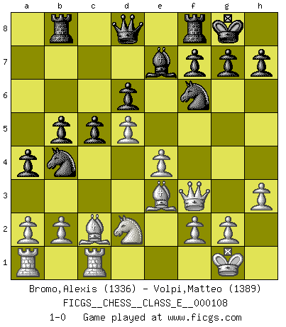 Last move : 1-0 2009 September 12 22:3:29 [Event "FICGS__CHESS__CLASS_E__000108"] [Site "FICGS"] [Date "2009.06.20"] [Round "1"] [White "Bromo,Alexis"] [Black "Volpi,Matteo"] [Result "1-0"] [WhiteElo "1336"] [BlackElo "1389"] 1.e4 e5 2.Nf3 Nc6 3.Bb5 d6 4.c3 a6 5.Ba4 b5 6.Bb3 Bg4 7.O-O Nf6 8.h3 Bxf3 9.Qxf3 Be7 10.Rd1 O-O 11.d4 Rb8 12.Be3 a5 13.Nd2 a4 14.Bc2 exd4 15.cxd4 Nb4 16.Rdc1 c5 17.d5 1-0 Ruy Lopez : Old Steinitz defense Kingside Castling by player White (move 7) Kingside Castling by player Black (move 10) Player White won this chess game. Follow this game move after move (download)In Chess, as it is played by masters, chance is practically eliminated. (Emanuel Lasker) Aljechin war kein Nazi. Er war ein Opportunist. Ein schrecklicher Mann. Er liebte Geld über alles und würde für Geld ein Jude, ein Katolik oder ein Protestant werden. (Miguel Najdorf) No hay un Gran Maestro de Ajedrez que sea normal; solo se diferencían ellos por la magnitud de su locura. (Viktor Korchnoi) Vous savez, camarade Pachman, je n'éprouve pas de plaisir à être ministre, je jouerais plutôt aux échecs comme vous, ou alors ferais une révolution au Venezuela. (Che Guevara à Ludek Pachman, 'Checkmate in Prague', 1975) To send light into the darkness of men's hearts - such is the duty of the artist. (Schumann)