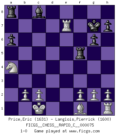 Last move : 1-0 2009 July 14 13:7:28 [Event "FICGS__CHESS__RAPID_C__000075"] [Site "FICGS"] [Date "2009.06.21"] [Round "1"] [White "Price,Eric"] [Black "Langlois,Pierrick"] [Result "1-0"] [WhiteElo "1631"] [BlackElo "1600"] 1.e4 c5 2.Nf3 d6 3.d4 cxd4 4.Nxd4 Nf6 5.Nc3 a6 6.Bg5 g6 7.Qd2 Bg7 8.a4 O-O 9.Bh6 Nc6 10.Bxg7 Kxg7 11.O-O-O b5 12.Nxc6 Qd7 13.e5 dxe5 14.Nxe5 Qxd2+ 15.Rxd2 bxa4 16.Nxa4 Ne4 17.Re2 f6 18.Rxe4 fxe5 19.Rxe5 Rf5 20.Rxe7+ 1-0 Sicilian : Najdorf, 6.Bg5 Kingside Castling by player Black (move 8) Queenside Castling by player White (move 11) Player White won this chess game. Follow this game move after move (download)Those who say they understand Chess, understand nothing. (Robert Hubner) Ich habe Kasparov in Rente geschickt. (Veselin Topalov) Todos los Maestros de Ajedrez fueron un día unos principiantes. (Chernev) Aucun coup ne doit être joué sans but. (Pedro Damiano) A good aphorism is too hard for the tooth of time, and is not worn away with the centuries, although it serves as food for every speech. (Friedrich Nietzsche)