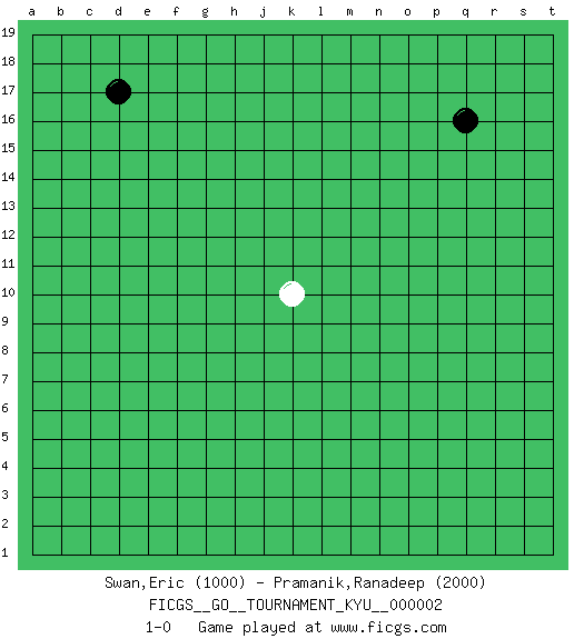 Last move : 1-0 2006 October 30 7:52:28 [Event "FICGS__GO__TOURNAMENT_KYU__000002"] [Site "FICGS"] [Date "2006.09.14"] [Round "1"] [Black "Swan,Eric"] [White "Pramanik,Ranadeep"] [Result "1-0"] [Rating 1 "1000"] [Rating 2 "2000"] 1.q16 k10 2.d17 1-0 This go game has been lost on time (started : 2006.09.14 16:49:34) Here are the names of the openings (joseki) played in the four corners : Player Black won this Go (weiqi, baduk) game. Follow this game move after move (download)The second line is the line of defeat, the third line is the line of territory, and the fourth line is the line of influence. (Anonymous) We need strong personalities and only one world champion to attract sponsors. (Anatoly Karpov)
