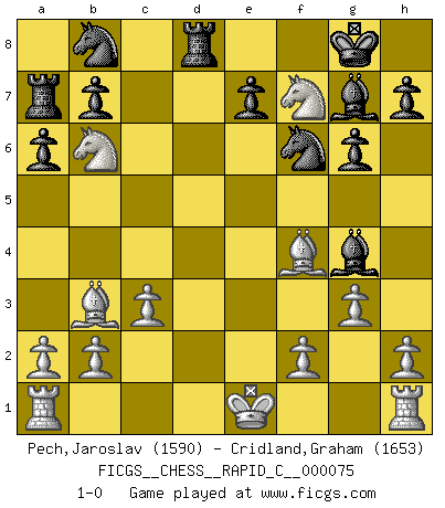 Last move : 1-0 2009 August 28 0:40:12 [Event "FICGS__CHESS__RAPID_C__000075"] [Site "FICGS"] [Date "2009.06.21"] [Round "1"] [White "Pech,Jaroslav"] [Black "Cridland,Graham"] [Result "1-0"] [WhiteElo "1590"] [BlackElo "1653"] 1.e4 c5 2.c3 d5 3.exd5 Qxd5 4.d4 Nf6 5.Nf3 g6 6.Na3 a6 7.Bc4 Qd6 8.Bb3 Bg7 9.Nc4 Qc7 10.g3 cxd4 11.Bf4 Qd8 12.Qxd4 O-O 13.Qxd8 Rxd8 14.Nb6 Bg4 15.Ng5 Ra7 16.Nxf7 1-0 Sicilian : Alapin's variation (2.c3) Kingside Castling by player Black (move 12) Player White won this chess game. Follow this game move after move (download)You have to have the fighting spirit. You have to force moves and take chances. (Bobby Fischer) Ein Isolani verdüstert die Stimmung auf dem ganzen Schachbrett. (Savielly Grigorievitsch Tartakower) Nada excita más a Grandes Maestros aburridos que una novedad teórica. (Dominic Lawson) Il vaut toujours mieux jouer un plan faux de façon logique que de n'avoir pas de plan du tout. (Victor Kortchnoï) When you stop learning you start dying. (M. Scott Adams)