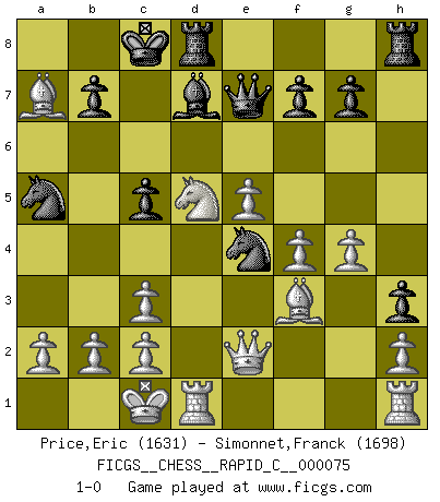 Last move : 1-0 2009 July 1 19:4:34 [Event "FICGS__CHESS__RAPID_C__000075"] [Site "FICGS"] [Date "2009.06.21"] [Round "1"] [White "Price,Eric"] [Black "Simonnet,Franck"] [Result "1-0"] [WhiteElo "1631"] [BlackElo "1698"] 1.e4 e5 2.Nf3 Nf6 3.Nc3 Bb4 4.Nxe5 Qe7 5.Nd3 Bxc3 6.dxc3 d5 7.e5 Nc6 8.f4 Ne4 9.g3 Bf5 10.Bg2 O-O-O 11.Qe2 h5 12.Be3 h4 13.g4 h3 14.Bf3 Bd7 15.O-O-O Na5 16.Nb4 c6 17.Bxa7 c5 18.Nxd5 1-0 Petrov Three knights game Queenside Castling by player Black (move 10) Queenside Castling by player White (move 15) Player White won this chess game. Follow this game move after move (download)Even the laziest King flees wildly in the face of a double check ! (Aaron Nimzowitsch) Strategie ist, wie man ein Mädchen auf den Rücksitz bekommt. Taktik ist, was man tut, wenn man dann dort ist. (Anonymous) Todos los Maestros de Ajedrez fueron un día unos principiantes. (Chernev) Les Echecs ne sont pas pour les âmes timides. Ils requièrent un homme entier, qui ne s'arrête pas aveuglément à ce qui a été déjà établi, mais qui tente individuellement de sonder les profondeurs du jeu. (W. Steinitz) Thibault, I ask for draw. Game 13876. - Sorry Ilmars, you won. (FICGS chat)
