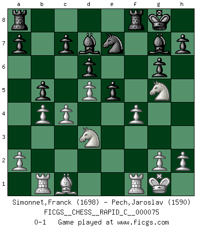 Last move : 0-1 2009 September 9 9:11:41 [Event "FICGS__CHESS__RAPID_C__000075"] [Site "FICGS"] [Date "2009.06.21"] [Round "1"] [White "Simonnet,Franck"] [Black "Pech,Jaroslav"] [Result "0-1"] [WhiteElo "1698"] [BlackElo "1590"] 1.d4 Nf6 2.c4 g6 3.Nc3 Bg7 4.e4 d6 5.Nf3 O-O 6.Be2 e5 7.O-O Nc6 8.d5 Ne7 9.b4 Nh5 10.Ne1 Nf4 11.Nd3 f5 12.Rb1 Nxe2+ 13.Qxe2 fxe4 14.Nxe4 Qd7 15.Ng5 Qg4 16.Qxg4 Bxg4 17.f3 Bd7 18.f4 b5 0-1 King's Indian : Orthodox, Aronin-Taimanov variation (Yugoslav attack / Mar del Plata variation) Kingside Castling by player Black (move 5) Kingside Castling by player White (move 7) Player Black won this chess game. Follow this game move after move (download)When you absolutely don't know what to do anymore, it is time to panic. (John van der Wiel) Versuche, dich von der Sklaverei der Eröffnungsvarianten zu befreien. Stattdessen soll man gewisse Typenpositionen erlernen, die man eingehend analysiert. (Aaron Nimzowitsch) El Ajedrez se juega con la mente... ¡no con las manos!. (Renaud y Kahn) Des combinaisons [dans le jeu d'échecs] pareilles à des mélodies. Je crois entendre pour ainsi dire la musique des coups... (Vladimir Nabokov) It's not enough to succeed. Others must fail. (Gore Vidal)