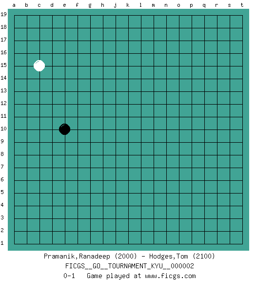 Last move : 0-1 2006 October 30 1:52:4 [Event "FICGS__GO__TOURNAMENT_KYU__000002"] [Site "FICGS"] [Date "2006.09.14"] [Round "1"] [Black "Pramanik,Ranadeep"] [White "Hodges,Tom"] [Result "0-1"] [Rating 1 "2000"] [Rating 2 "2100"] 1.e10 c15 0-1 This go game has been lost on time (started : 2006.09.14 16:49:34) Here are the names of the openings (joseki) played in the four corners : Player White won this Go (weiqi, baduk) game. Follow this game move after move (download)In the sound of the stone you can hear its purpose. (Pierre Audouard) Even the best needles are not sharp at both ends. (Chinese proverb)